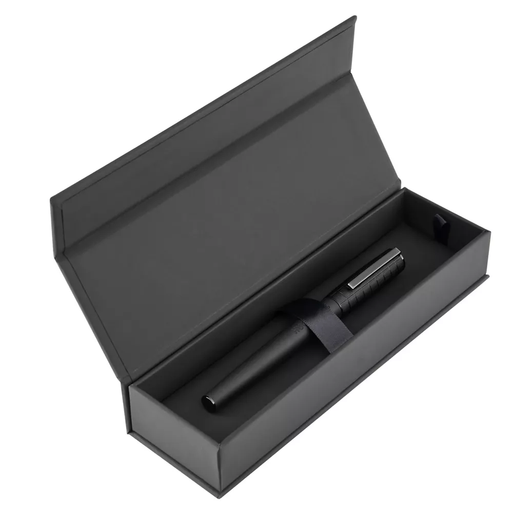 Hugo Boss Rollerball pribor za pisanje predstavlja dinamičan kontrast grafičkih elemenata i inovativnih tonalnih završnica – kombinaciju gumiranog laka i brušenog rešetkastog uzorka, inspirisanog Bauhaus estetikom.