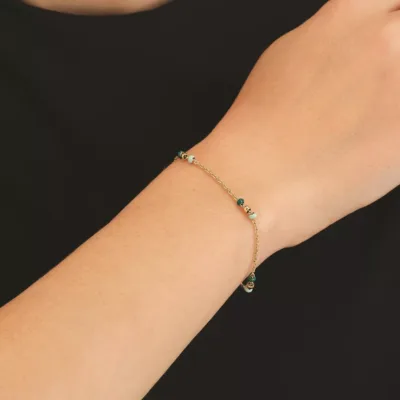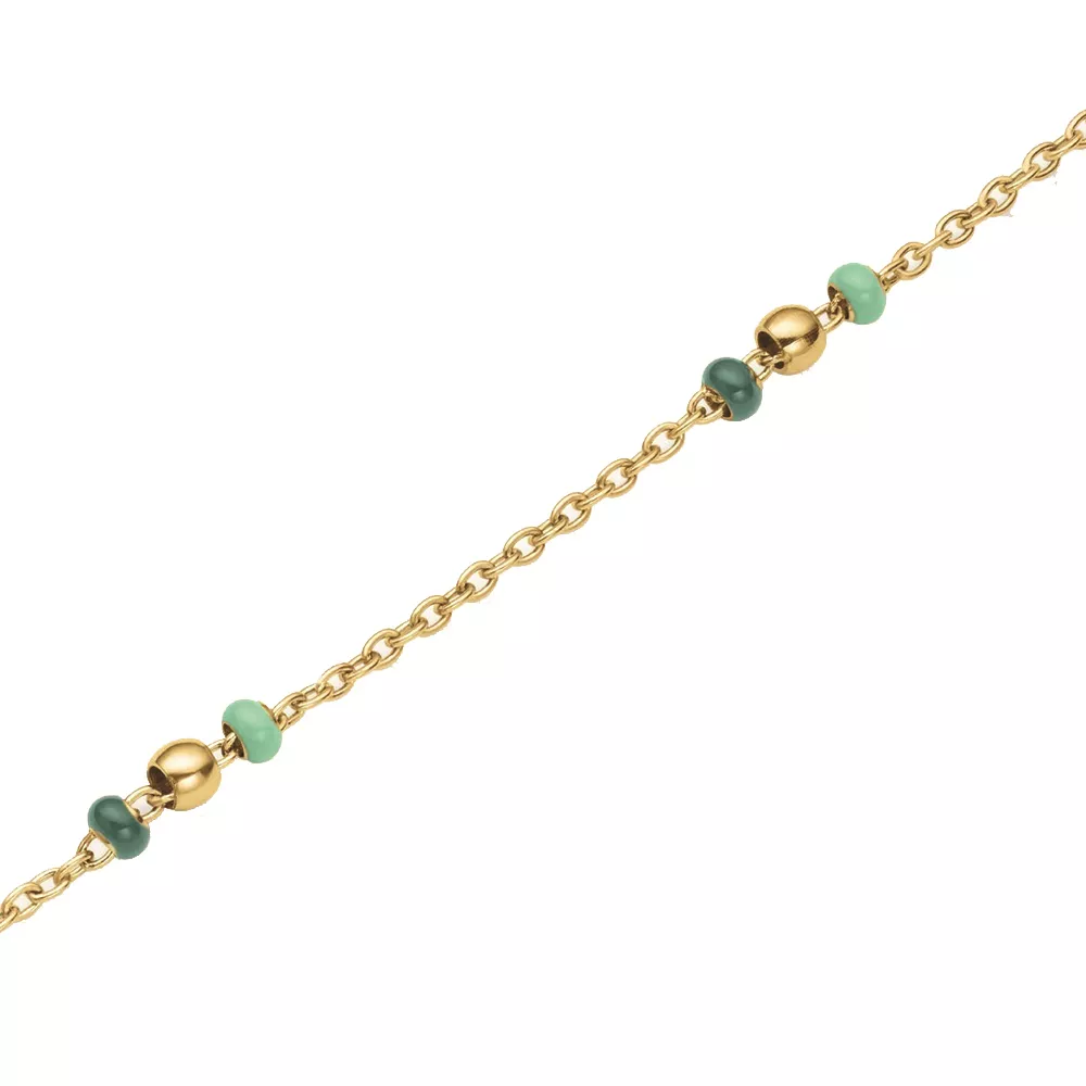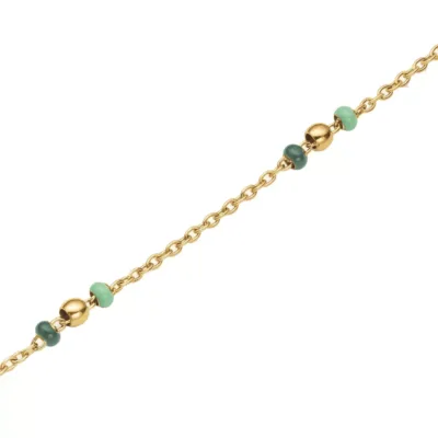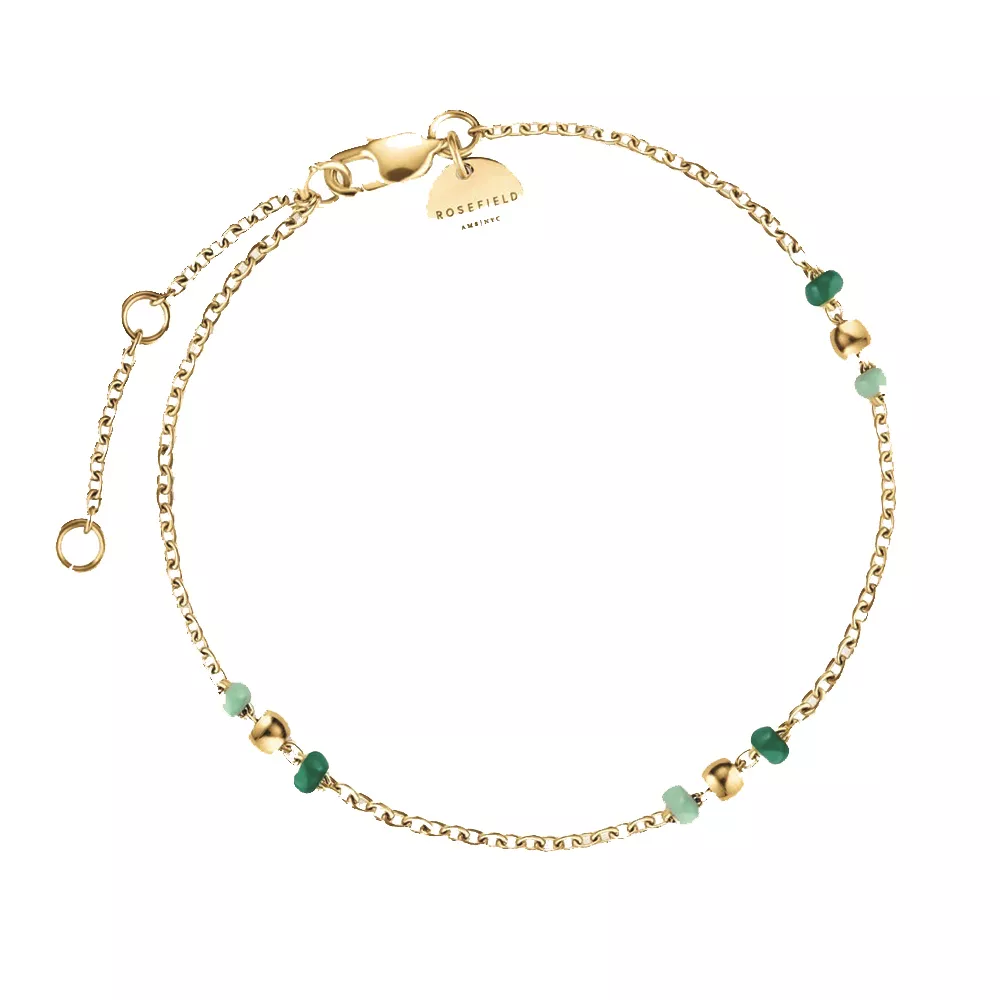 Rosefield ženska narukvica od nerđajućeg čelika u boji zlata sa perlama u zelenoj boji. Dužina 19,5cm (16,5cm + 3cm)
