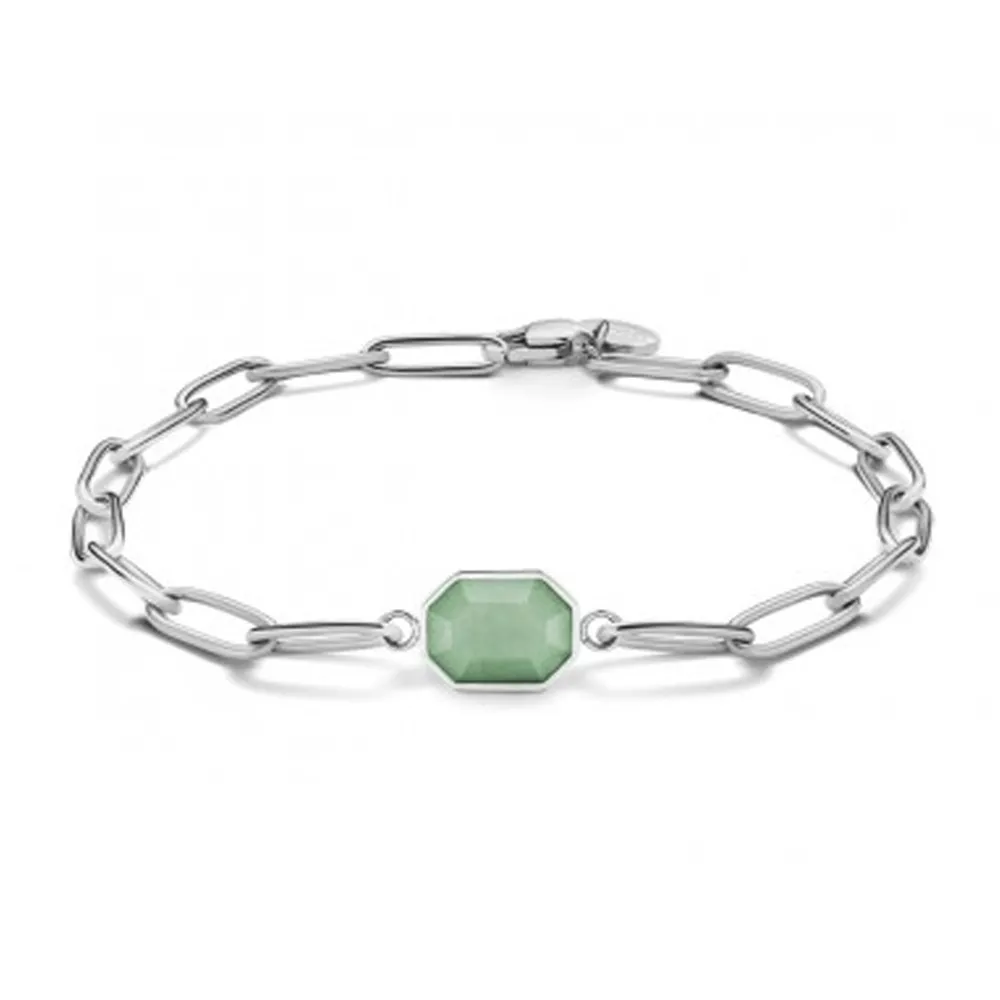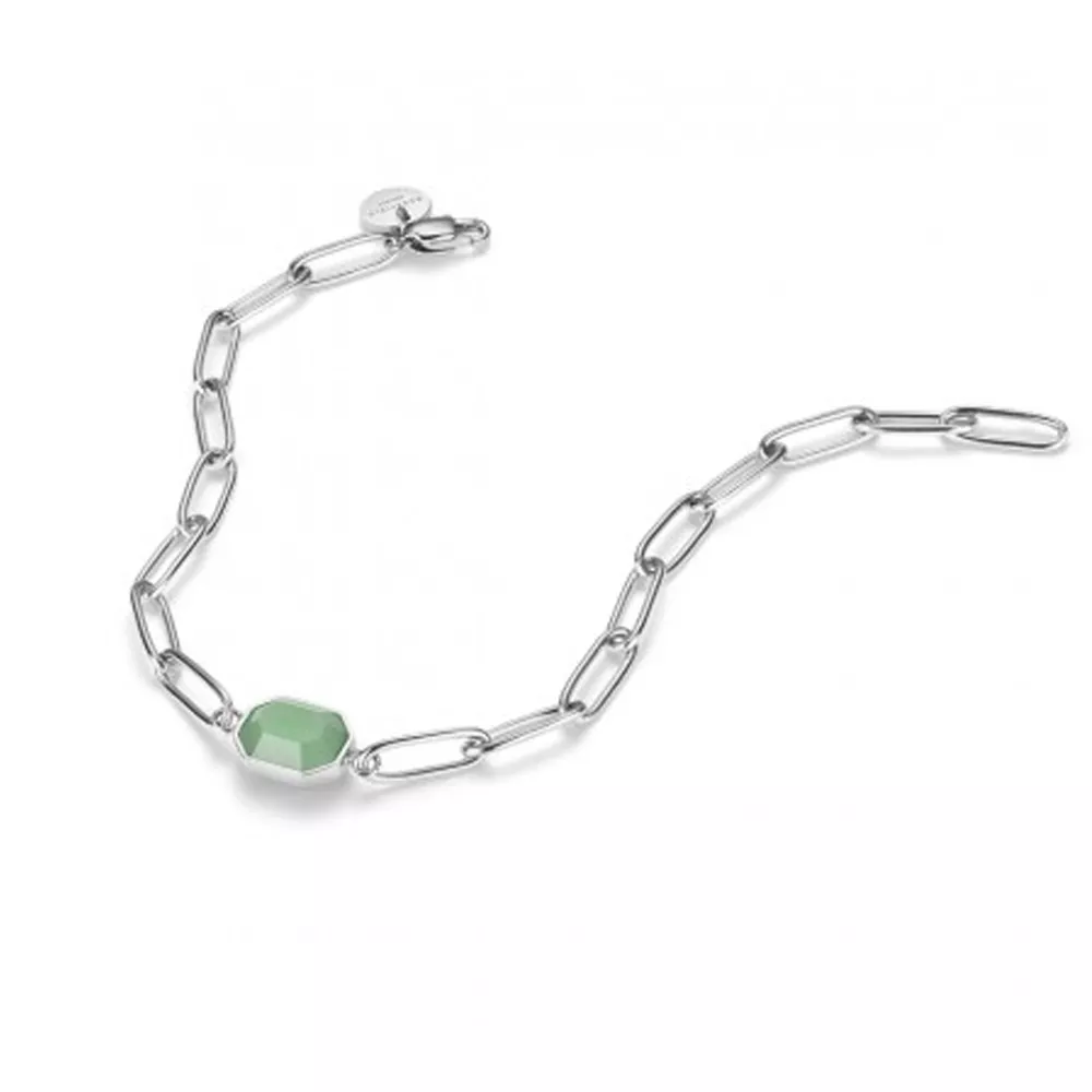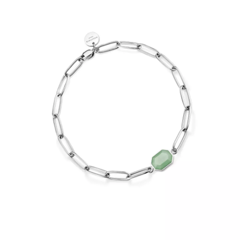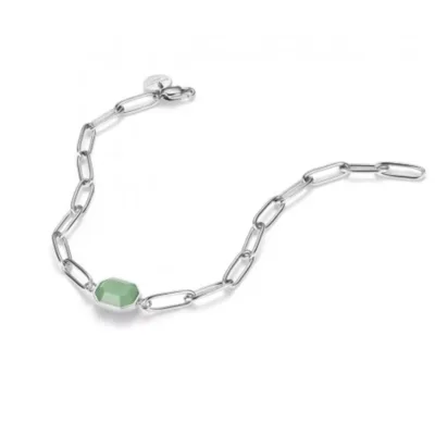 Dodajte boju svom nakitu. Ovaj komad je ukrašen ručno rezanim polu dragim kamenom aventurin u prelepoj zelenoj nijansi. Aventurin je kvarc koji simbolizuje prosperitet i samopouzdanje. Narukvica od nerđajućeg čelika u boji srebra sa poludragim kamenom aventurin u zelenoj boji. Dužina ove divne ogrlice je podesiv, 16,5cm – 19,5cm.