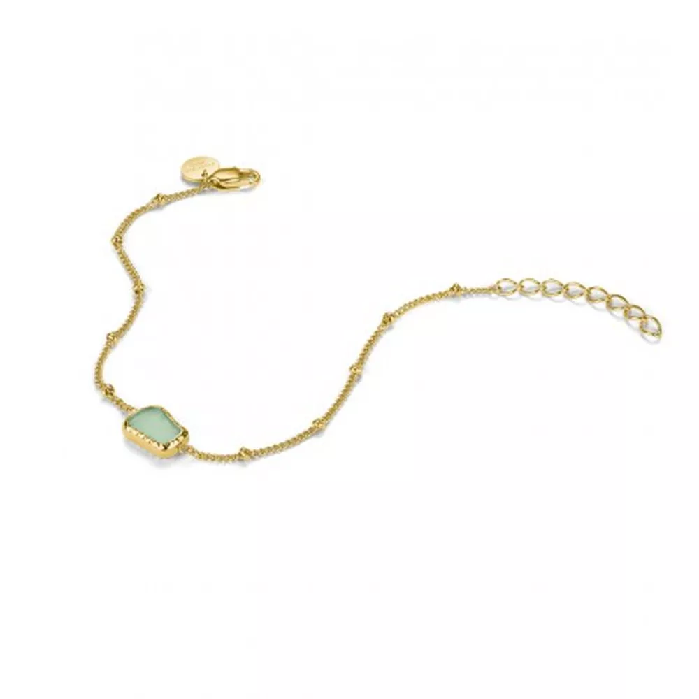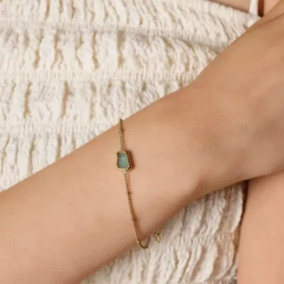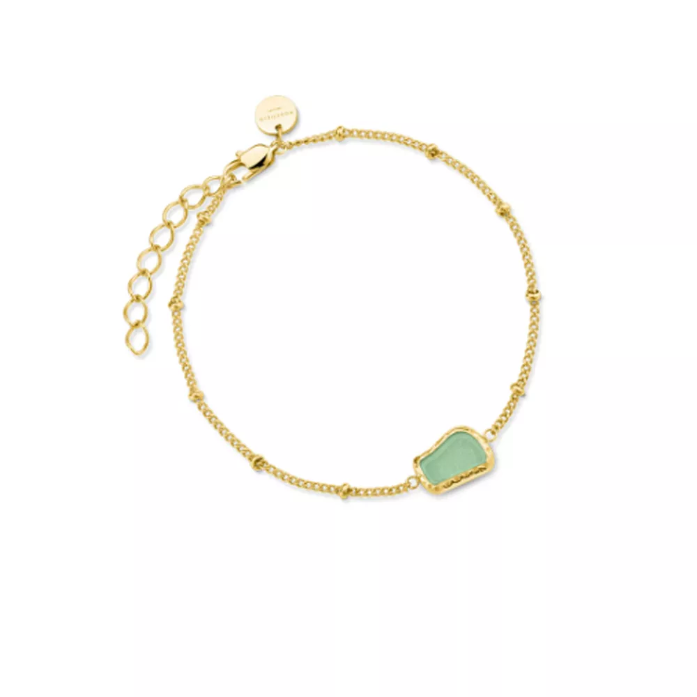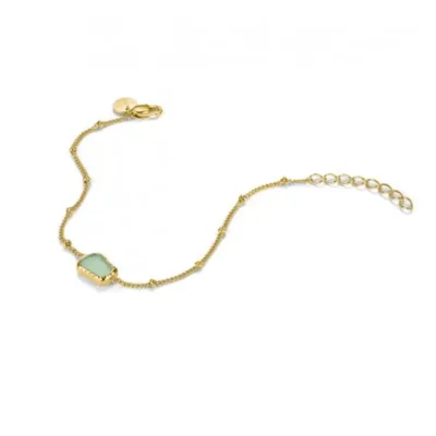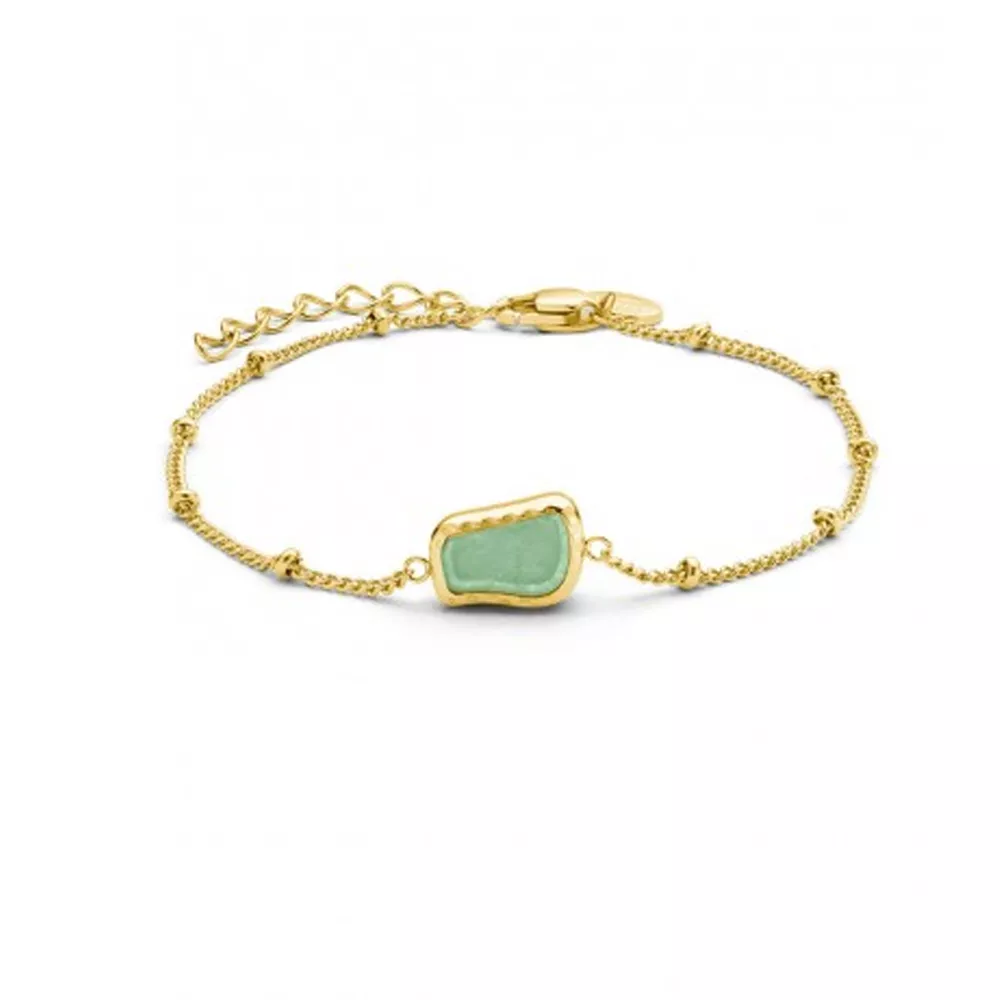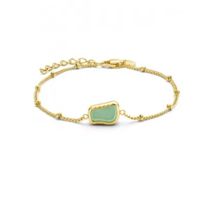 Dodajte boju svom nakitu. Ovaj komad je ukrašen ručno rezanim polu dragim kamenom aventurin u prelepoj zelenoj nijansi. Aventurin je kvarc koji simbolizuje prosperitet i samopouzdanje. Narukvica od nerđajućeg čelika u boji žutog zlata sa poludragim kamenom aventurin u zelenoj boji. Dužina je podesiva, 16,5cm – 19,5cm