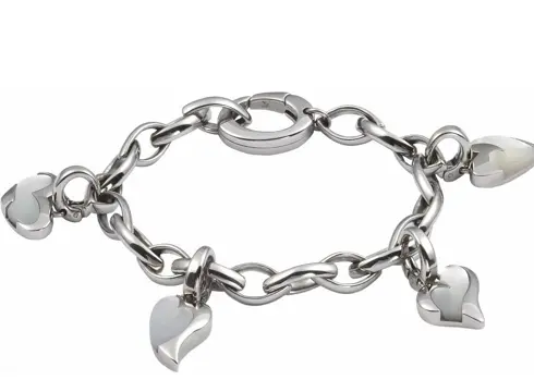Ženska narukvica izrađena od kvaitetnog čelika.Srebrne je boje i dodatno ukrašena privescima u vidu srca.Savršen je dodatak svakodnevnoj odevnoj kombinaciji.