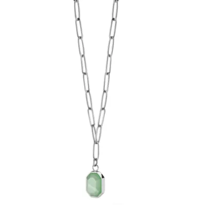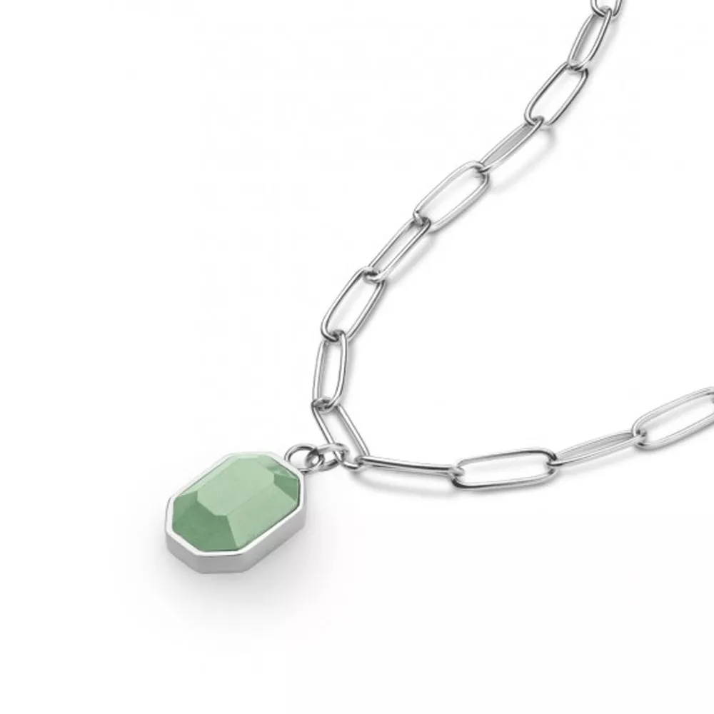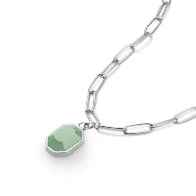 Dodajte boju svom nakitu. Ovaj komad je ukrašen ručno rezanim polu dragim kamenom aventurin u prelepoj zelenoj nijansi. Aventurin je kvarc koji simbolizuje prosperitet i samopouzdanje. Ogrlica od nerđajućeg čelika u boji srebra sa poludragim kamenom aventurin u zelenoj boji. Dužina je podesiva: 50cm – 54cm