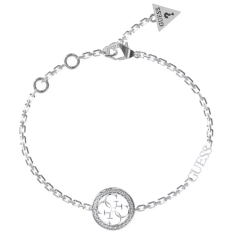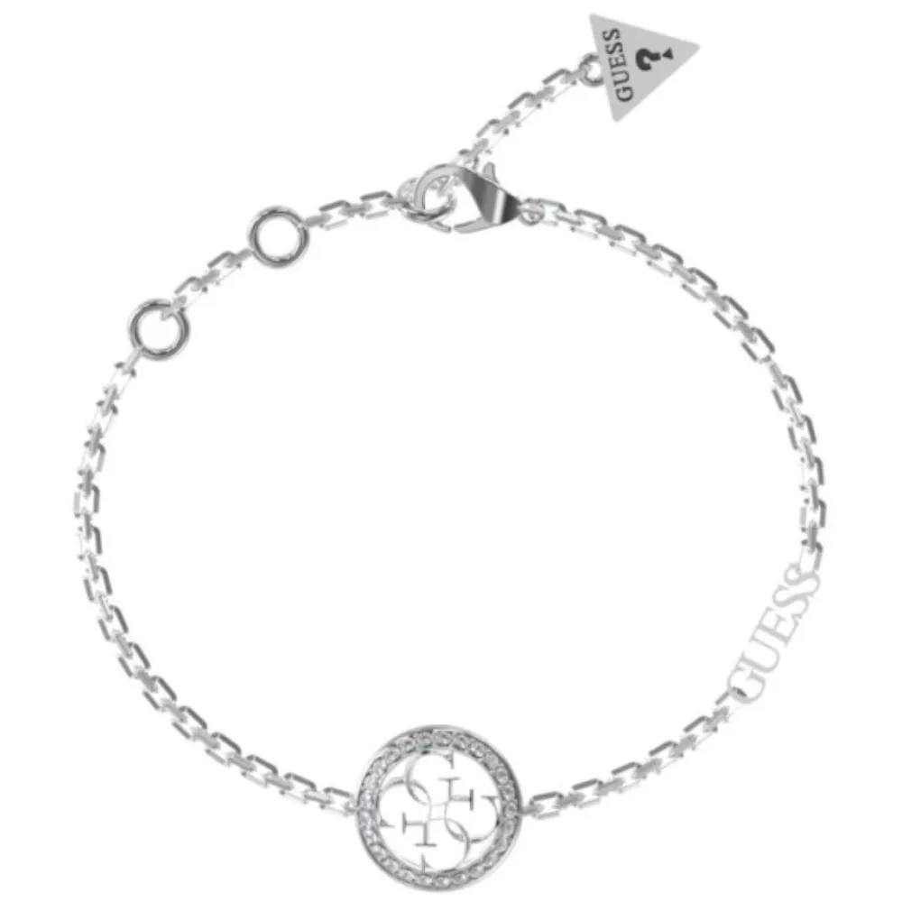 "4G LOGO LOOP" narukvica od nerđajućeg čelika u boji srebra sa detaljem: plosnati krug 4G, ispisan logotip GUESS i cirkoni dužina: 14,6 cm + 3,8 cm