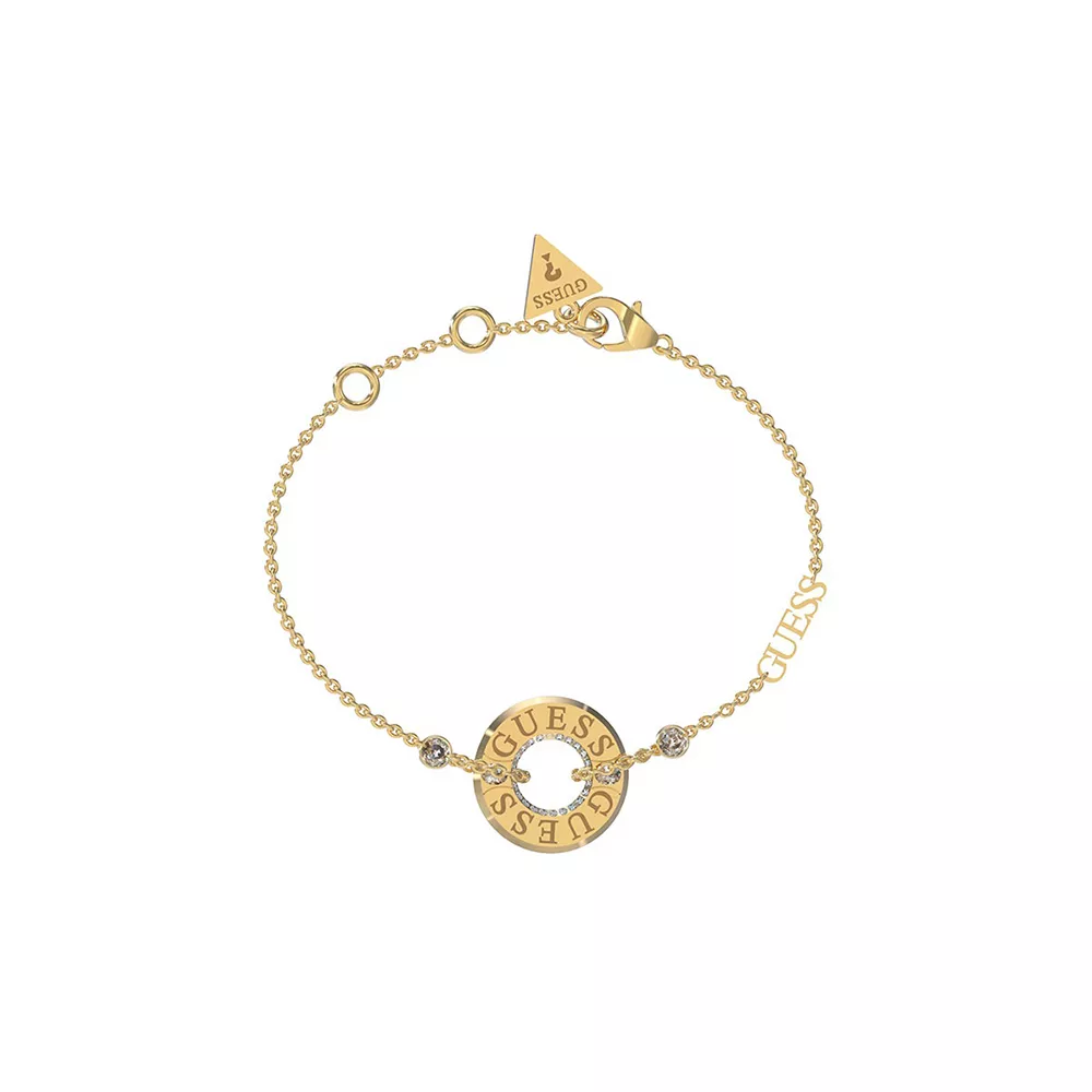 Ženska narukvica brenda Guess od nerđajućeg čelika zlatne boje sa prstenastim priveskom.