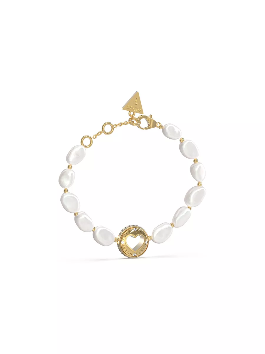 Guess narukvica sa kultivisanim slatkovodnim biserima i delovima od nerđajućeg čelika u boji žutog zlata, centralni detalj: krug sa cirkonima, udubljenje u obliku srca.