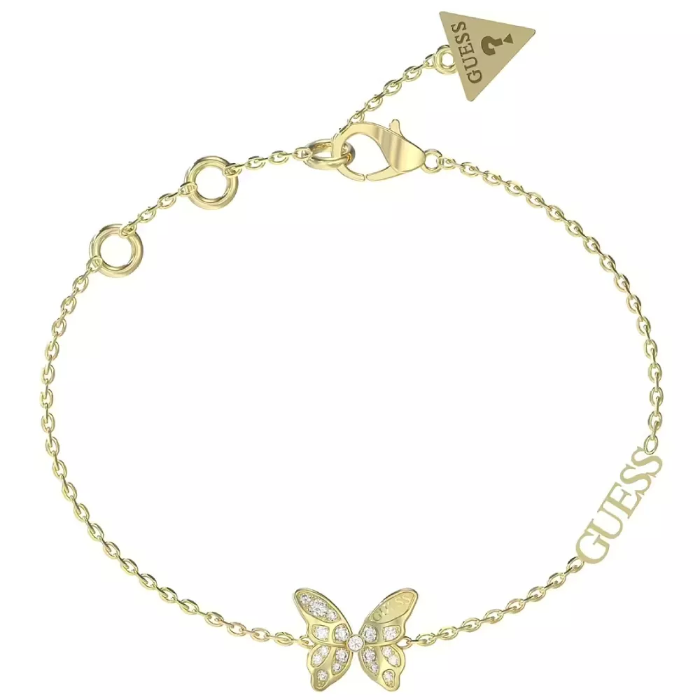 Guess "CHRYSALIS" narukvica od nerđajućeg čelika u boji žutog zlata sa centralnim detaljem: leptir sa cirkonima.