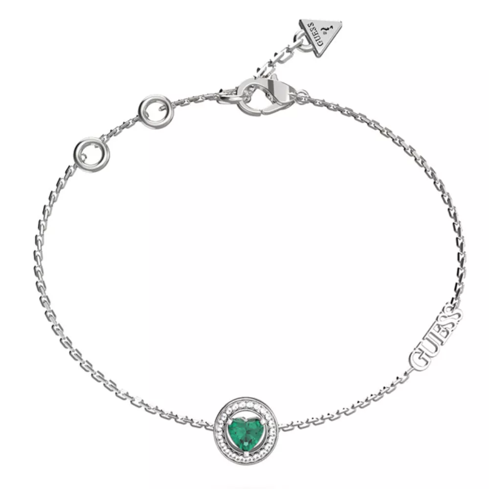 GUESS ženska narukvica od nerđajućeg čelika u srebrnoj, sa priveskom cirkon zelene boje u obliku srca. Veličina: 14,6cm + 3,8cm