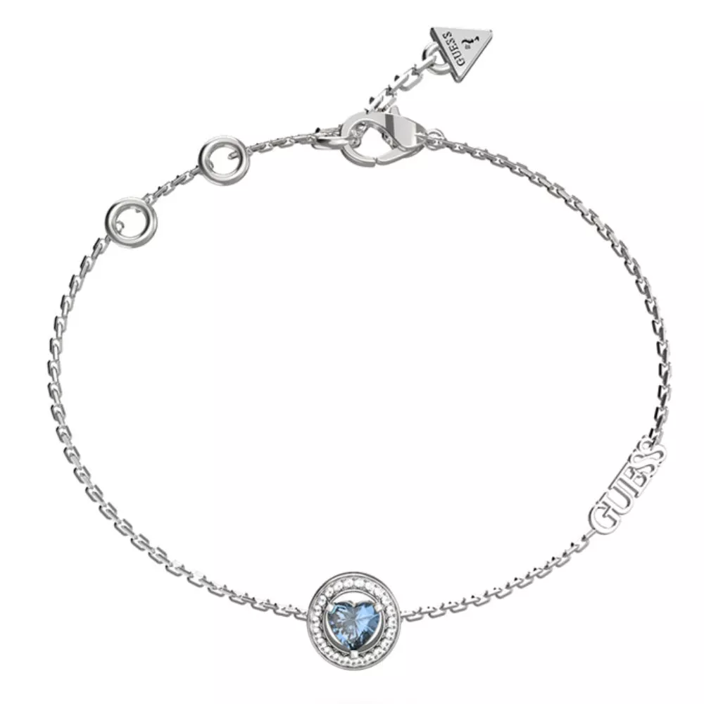 GUESS ženska narukvica od nerđajućeg čelika u srebrnoj, sa priveskom cirkon u obliku srca plave boje. Veličina: 14,6cm + 3,8cm