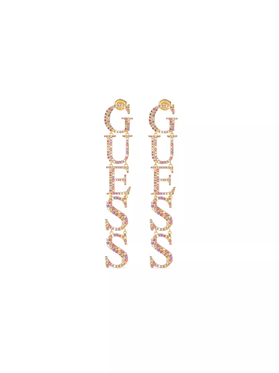 "CRYSTAL HARMONY" viseće minđuše od nerđajućeg čelika u boji žutog zlata: GUESS logotip sa šarenim cirkonima dužina: 8cm