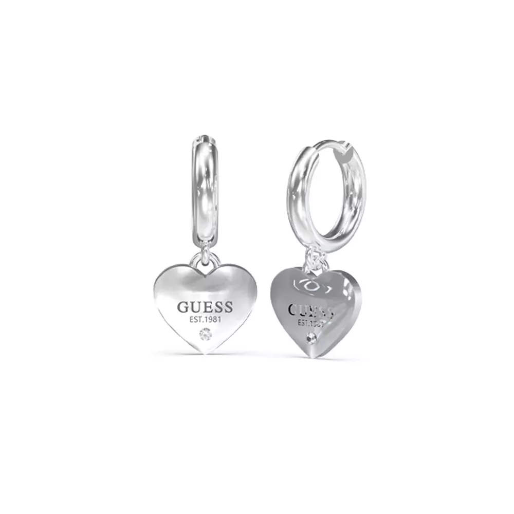 Ženske minđuše brenda Guess u obliku srca sa natpisom brenda.