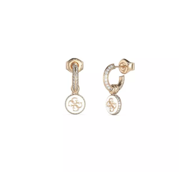GUESS minđuše od nerđajućeg čelika u boji roze zlata: mala alkica sa cirkonima i viseći privezak krug sa belim emajlom i 4G logotip.