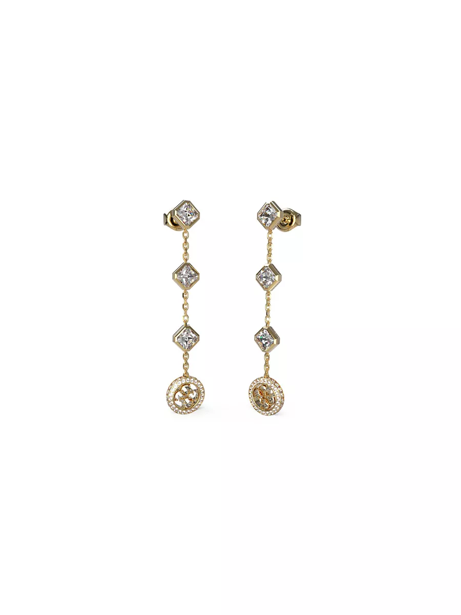 GUESS ženske viseće minđuše od nerđajućeg čelika u boji žutog zlata; providni cirkoni i krug sa cirkonima i 4G logotip.