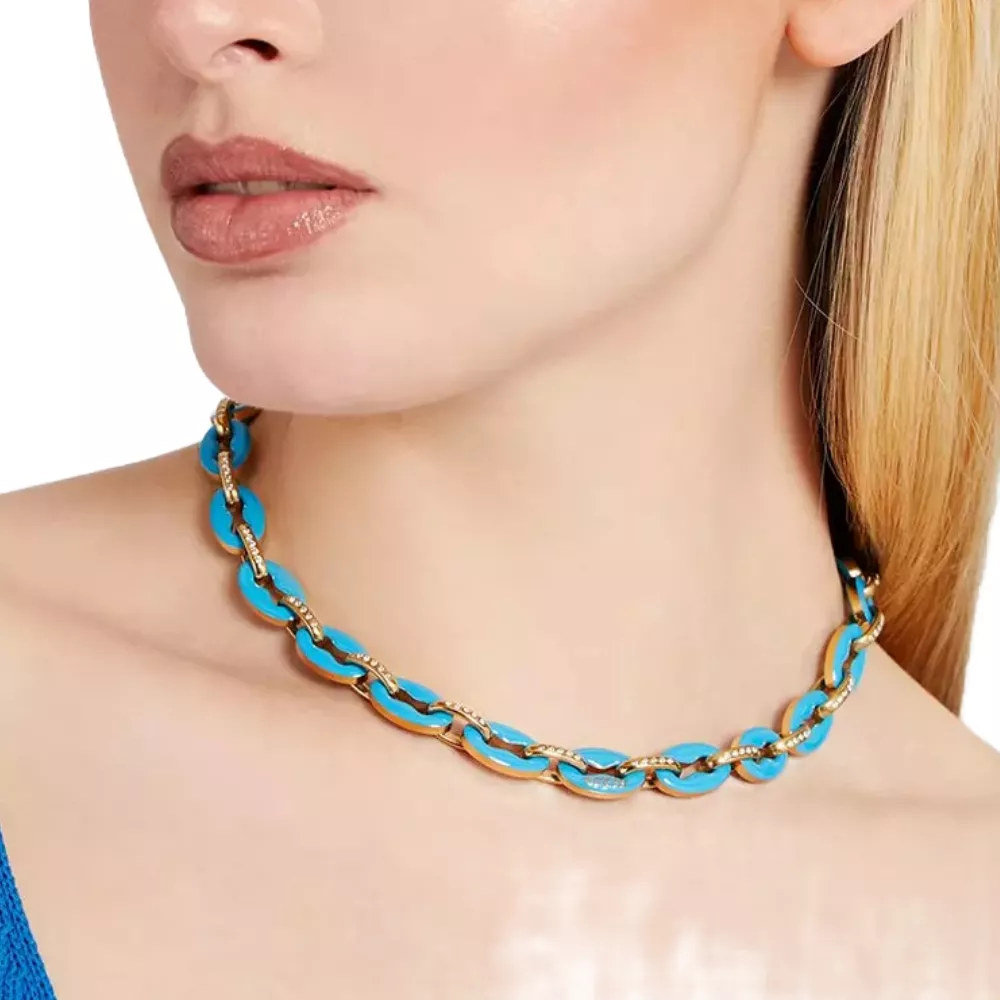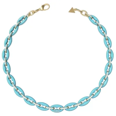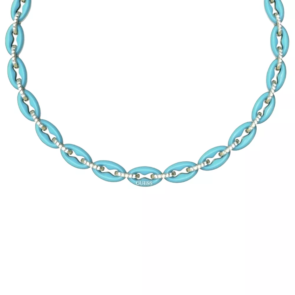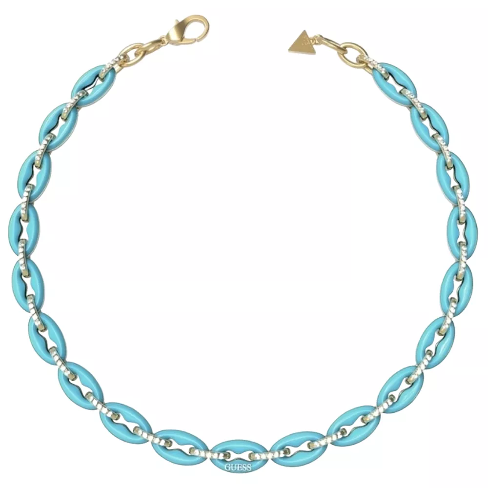 Ženska ogrlica brenda Guess od nerđajućeg čelika sa tirkiznim detaljima.