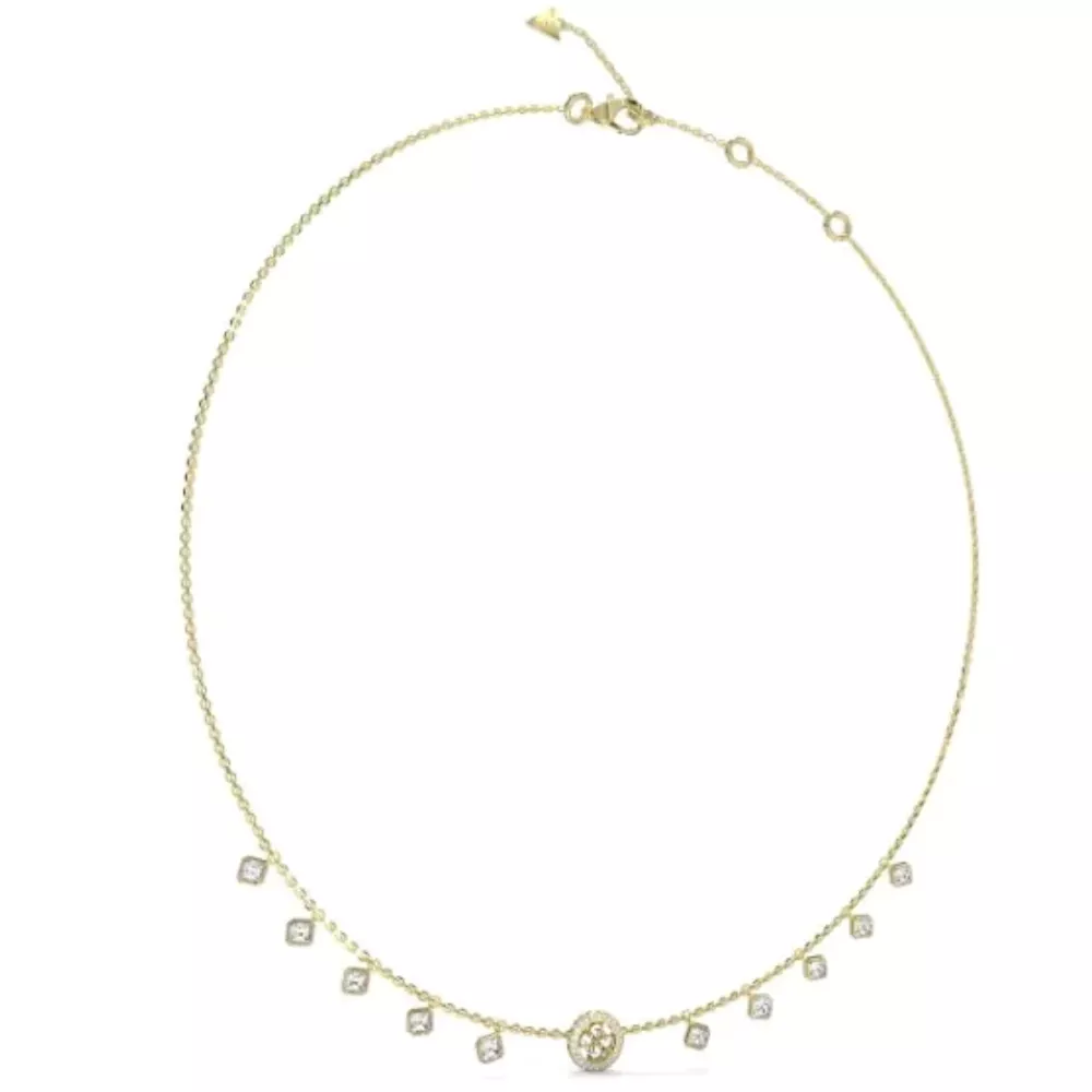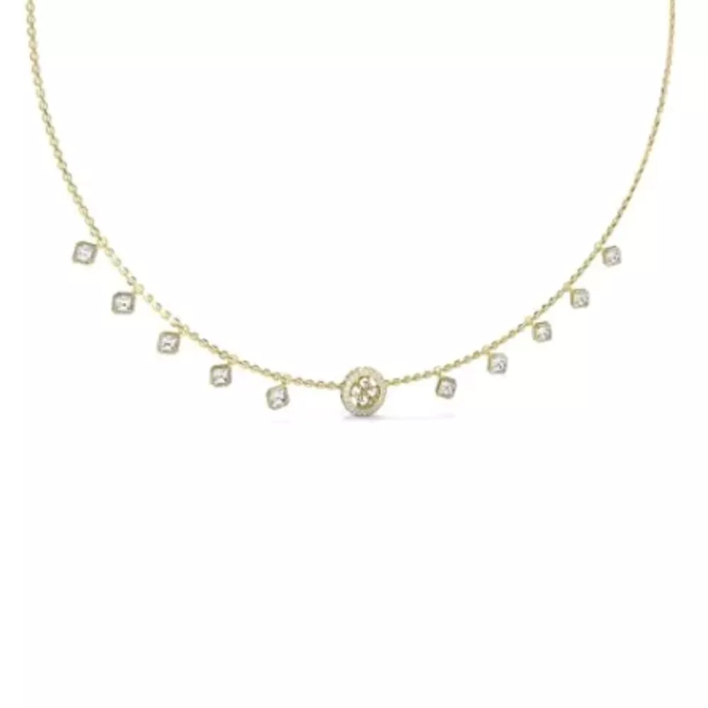 Guess ženska ogrlica od nerđajućeg čelika u boji žutog zlata sa više visećih privezaka: providni beli cirkoni i krugom sa cirkonima sa strane i šarom 4G logotip.