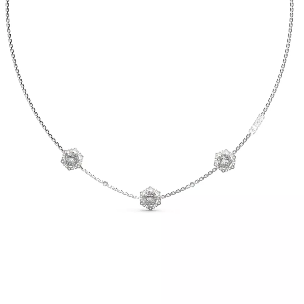 Guess ogrlica od nerđajućeg čelika u boji srebra sa tri božur cveta sa cirkonima. Podesiva dužina 41- 46cm.