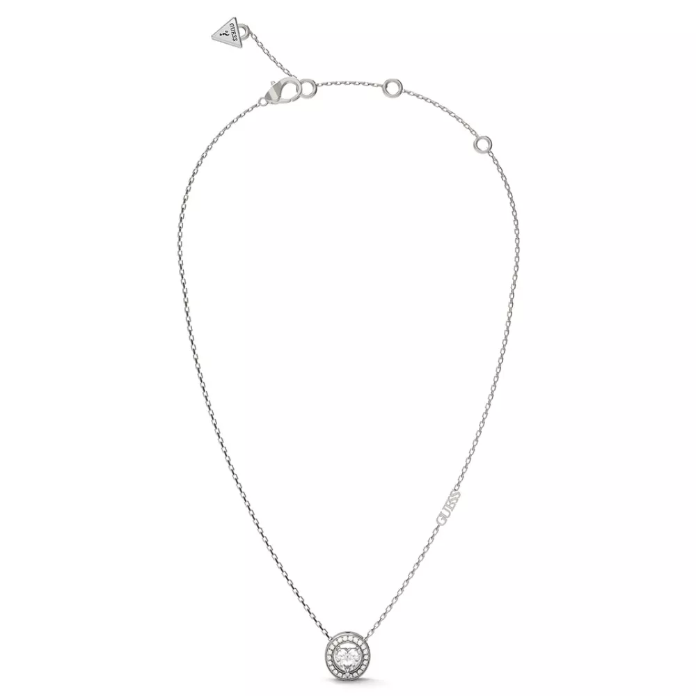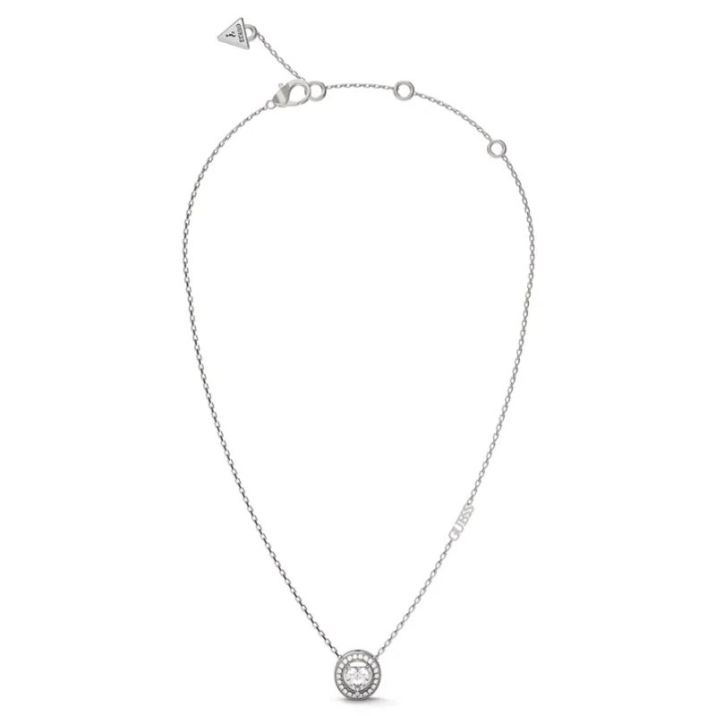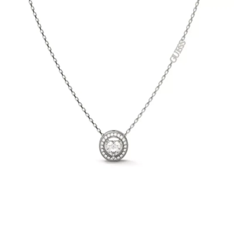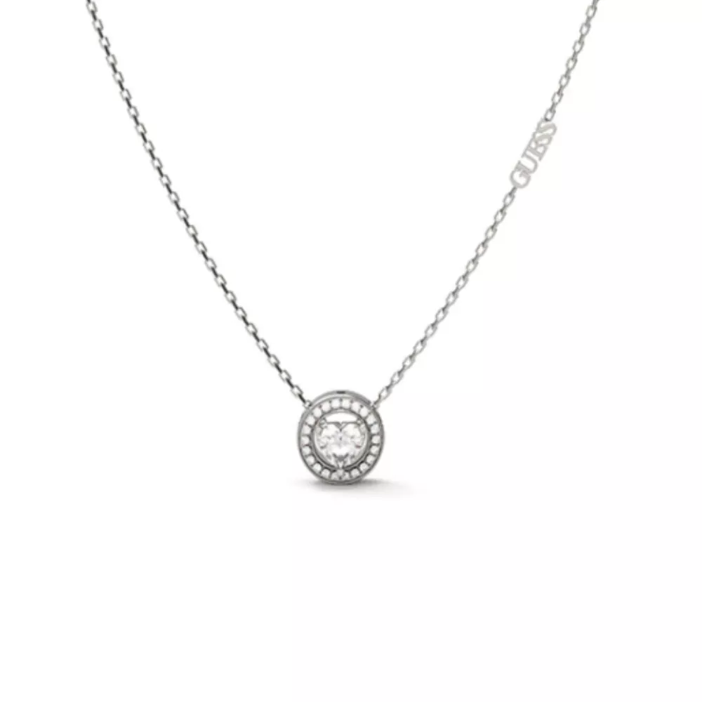 Guess ogrlica od nerđajućeg čelika u boji srebra, sa cirkonom bele boje u obliku srca.. Podesiva dužina 41- 46cm.