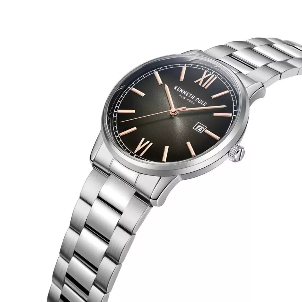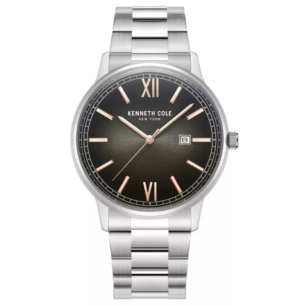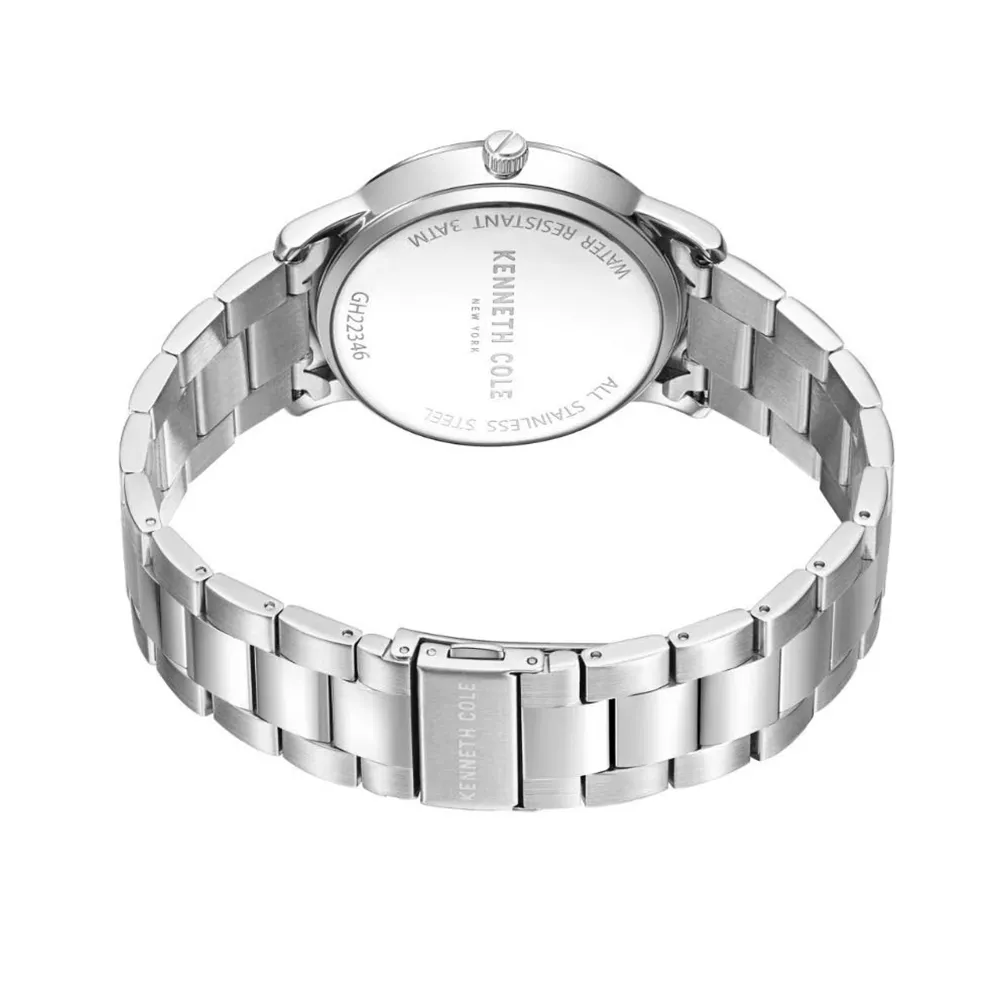 Muški ručni sat brenda Kenneth Cole. Elegantan model sa kućištem i narukvicom izrađenim od nerđajućeg čelika, sa klasičnim brojčanikom u crnoj boji.