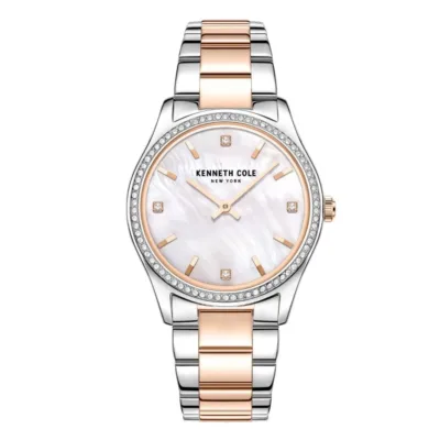 Ženski ručni sat bredna Kenneth Cole. Kućište je boje srebra a narukvica u kombinaciji srebrne i boje roze zlata savršeno se uklapa u dizajn brojčanika koji je okružen kristalima.Uklopiv je uz sve stilove što ga čini neizostavnim delom vaše odevne kombinacije.