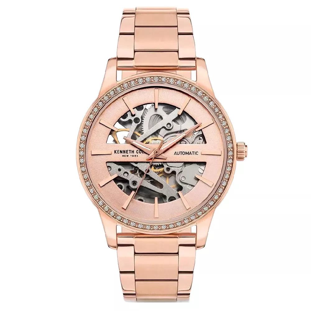 Ženski ručni sat brenda Kenneth Cole sa skeletnim brojčanikom. Okružem svetlucavim kristalima,pleni impresivnim spletom zupčanika koje otkriva, podeljen na dva dela označavajući vreme kazaljkama i indeksima boje roze zlata. Narukvica je izrađena od nerđajućeg čelika sa PVD tretmanom ružičastog zlata. Krase ga tri karike koji će vam ponuditi fleksibilonst i pružiti vam optimalnu udobnost. Sofisticiran,sa puno detalja ovaj sat će vašoj rutini dodati dašak šika.