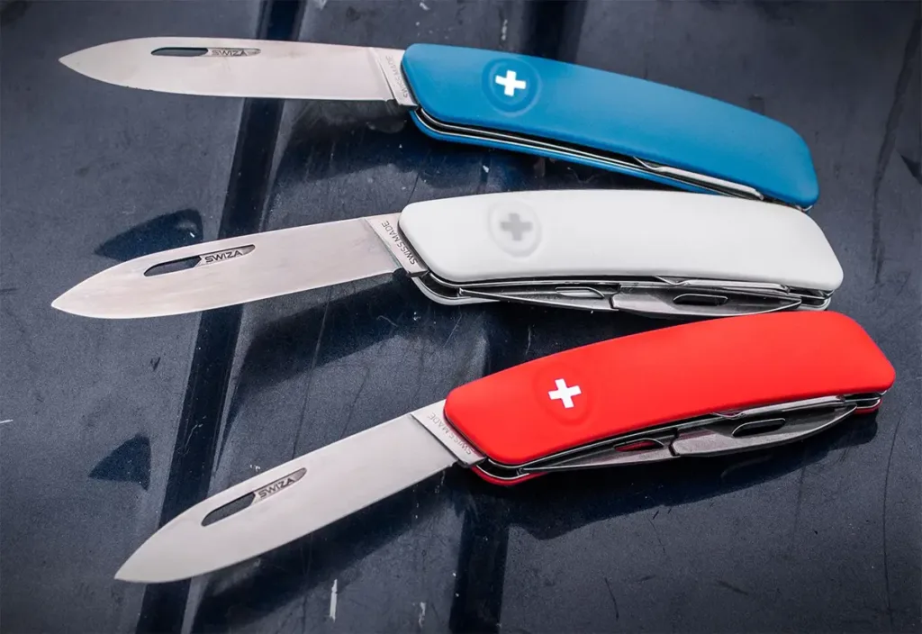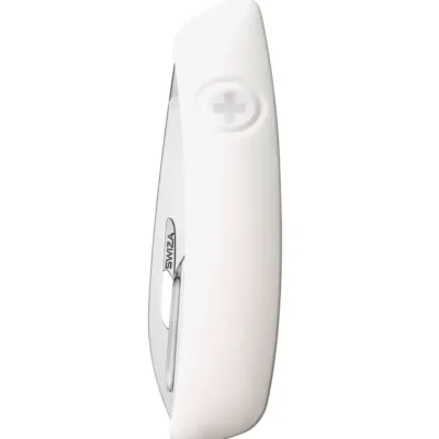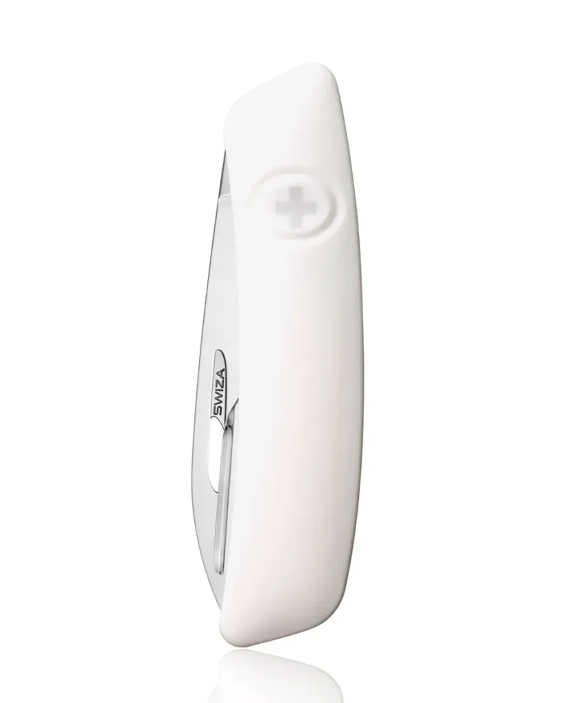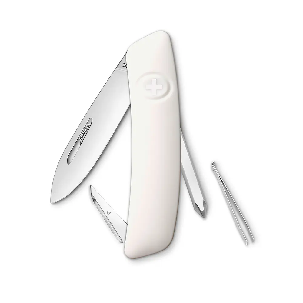 Swiza nožić u beloj boji poseduje 6 funkcija. Ergonomski zakrivljeni oblik noža omogućava bolji i lakši pristup alatima, a otvori za rezanje olakšavaju otvaranje levom ili desnom rukom. Gumeni držač je mek i udoban, sadrži logotip SWIZA i otporan je na ogrebotine. Nakon upotrebe noža, pritiskom na logotip deaktivirate kočnicu i sečivo vraćate u prvobitni položaj.Sečivo je izrađeno od visokokvalitetnog i ekstremno tvrdog nerđajućeg čelika visoke tvrdoće.