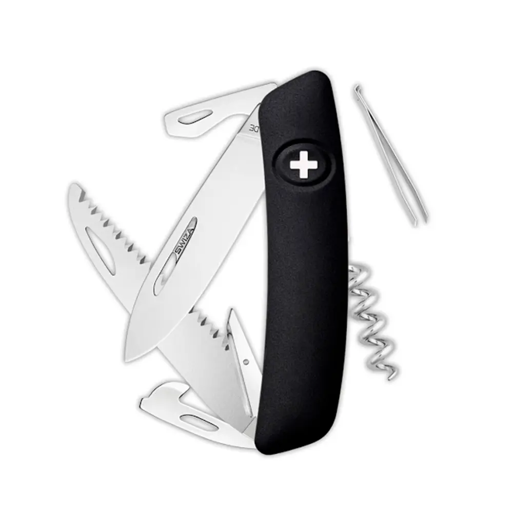 Swiza nožić u crnoj boji poseduje 12 funkcija.Ergonomski zakrivljeni oblik noža omogućava bolji i lakši pristup alatima, a otvori za rezanje olakšavaju otvaranje levom ili desnom rukom. Gumeni držač je mek i udoban, sadrži logotip SWIZA i otporan je na ogrebotine. Nakon upotrebe noža, pritiskom na logotip deaktivirate kočnicu i sečivo vraćate u prvobitni položaj. Dužina noža je 95 mm. Sečivo je izrađeno od visokokvalitetnog i ekstremno tvrdog nerđajućeg čelika visoke tvrdoće.
