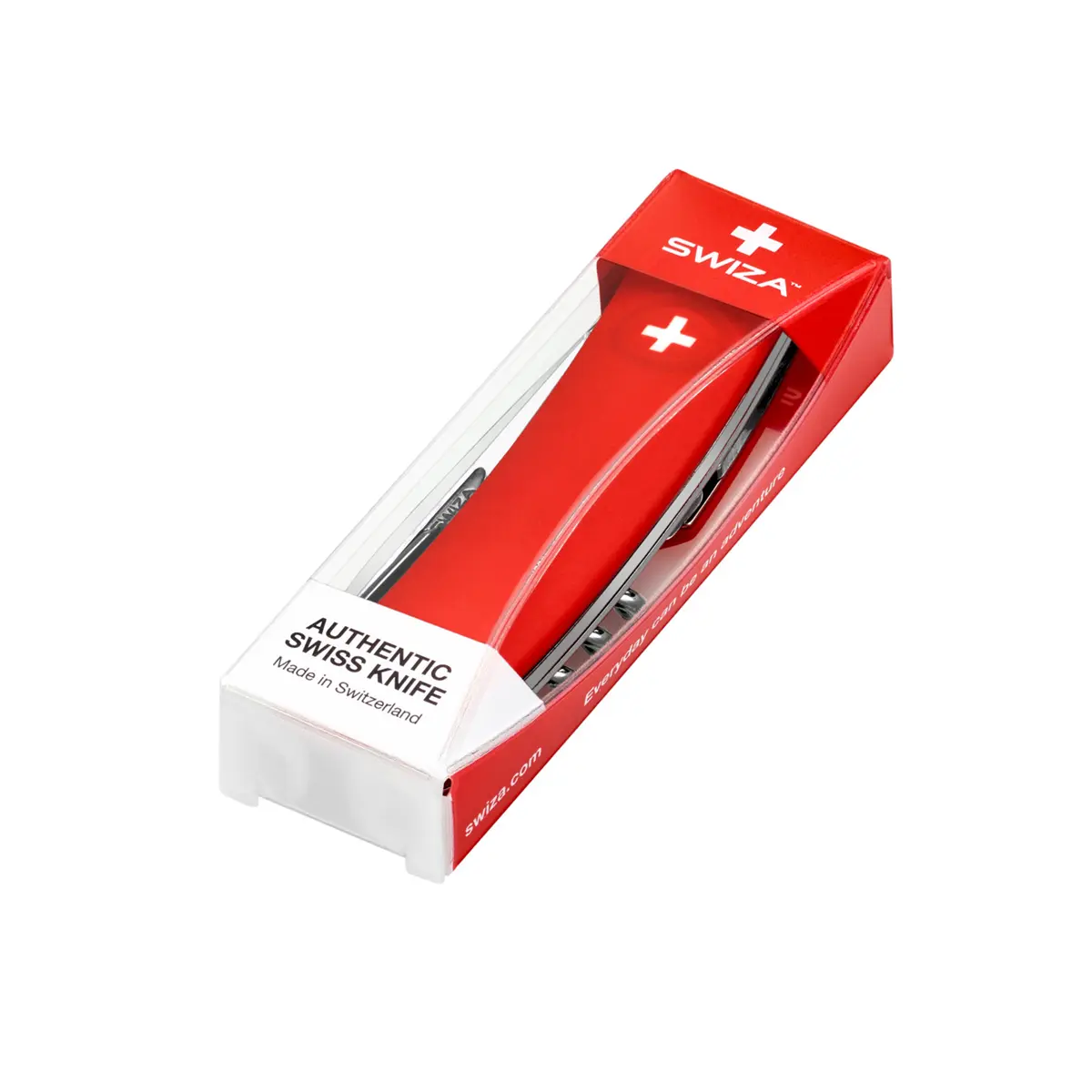 Ergonomski zakrivljeni oblik noža omogućava bolji i lakši pristup alatima, a otvori za rezanje olakšavaju otvaranje levom ili desnom rukom. Gumeni držač je mek i udoban, sadrži logotip SWIZA i otporan je na ogrebotine. Nakon upotrebe noža, pritiskom na logotip deaktivirate kočnicu i sečivo vraćate u prvobitni položaj. Dužina noža je 95 mm. Sečivo je izrađeno od visokokvalitetnog i ekstremno tvrdog nerđajućeg čelika visoke tvrdoće. Pored osnovnog alata, nožić je opremljen alatom za vađenje krpelja.