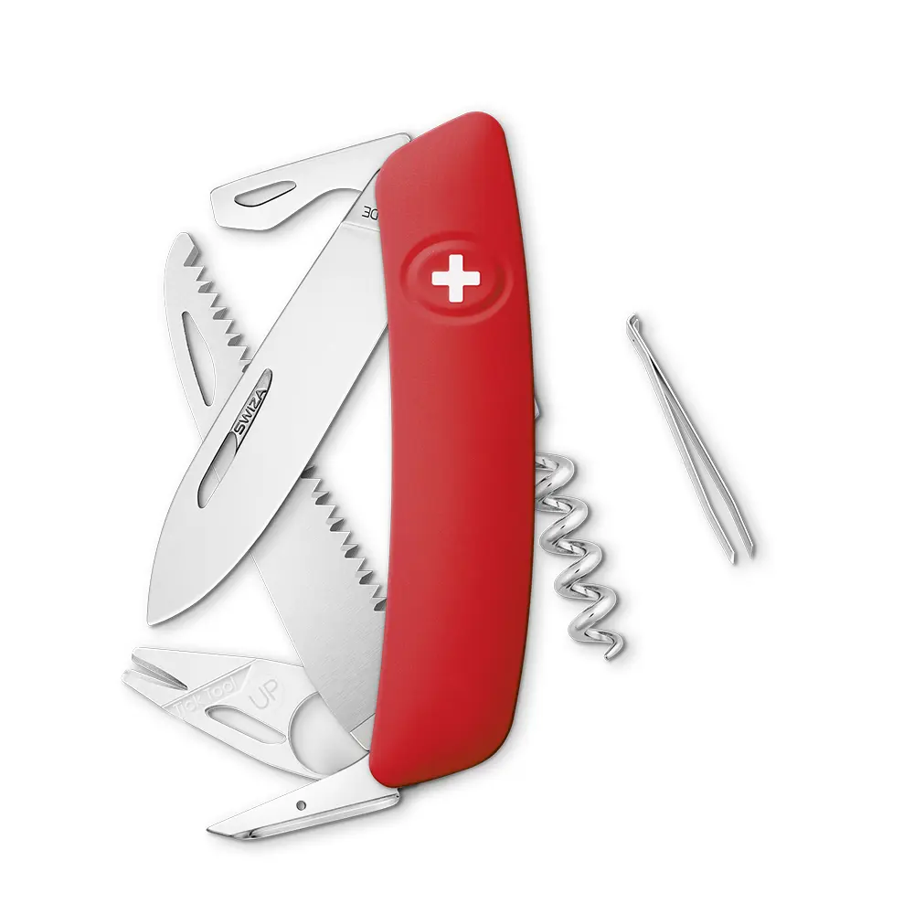 Ergonomski zakrivljeni oblik noža omogućava bolji i lakši pristup alatima, a otvori za rezanje olakšavaju otvaranje levom ili desnom rukom. Gumeni držač je mek i udoban, sadrži logotip SWIZA i otporan je na ogrebotine. Nakon upotrebe noža, pritiskom na logotip deaktivirate kočnicu i sečivo vraćate u prvobitni položaj. Dužina noža je 95 mm a težina 104g. Sečivo je izrađeno od visokokvalitetnog i ekstremno tvrdog nerđajućeg čelika visoke tvrdoće. Pored osnovnog alata, nožić je opremljen alatom za vađenje krpelja i testericom.
