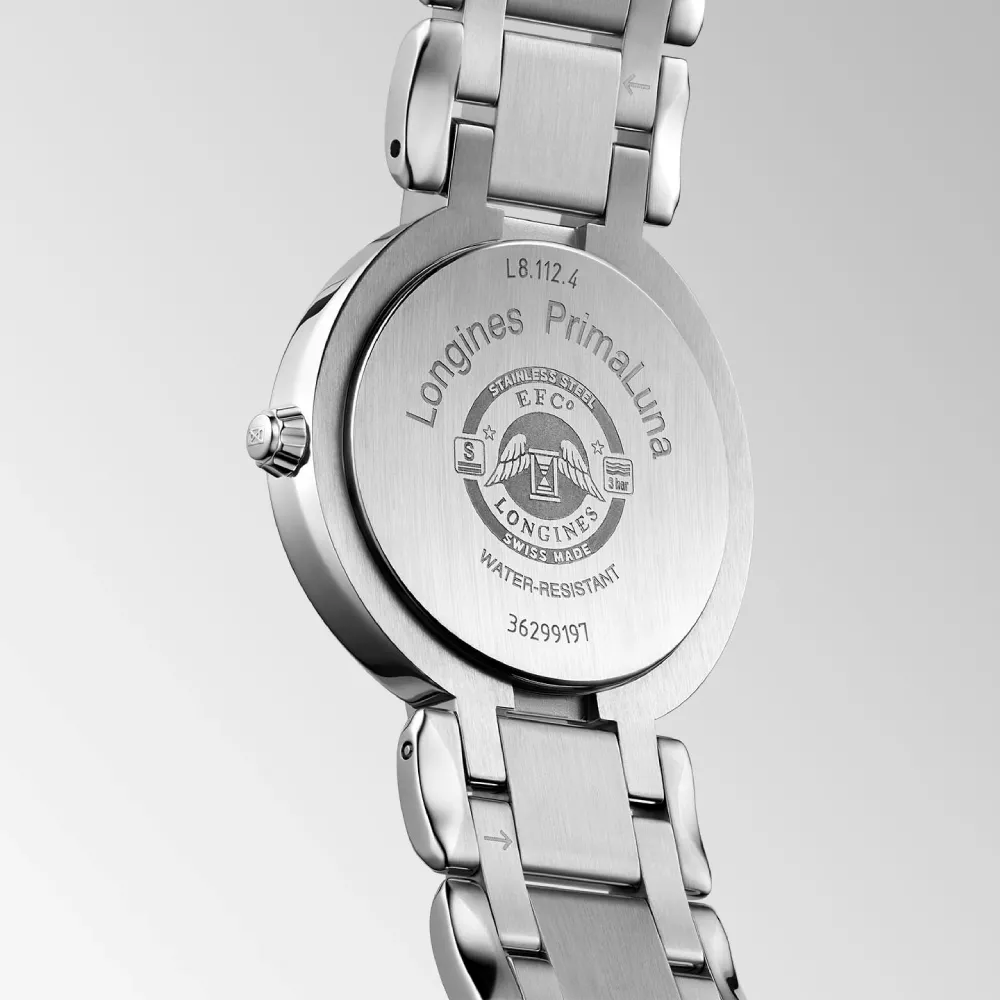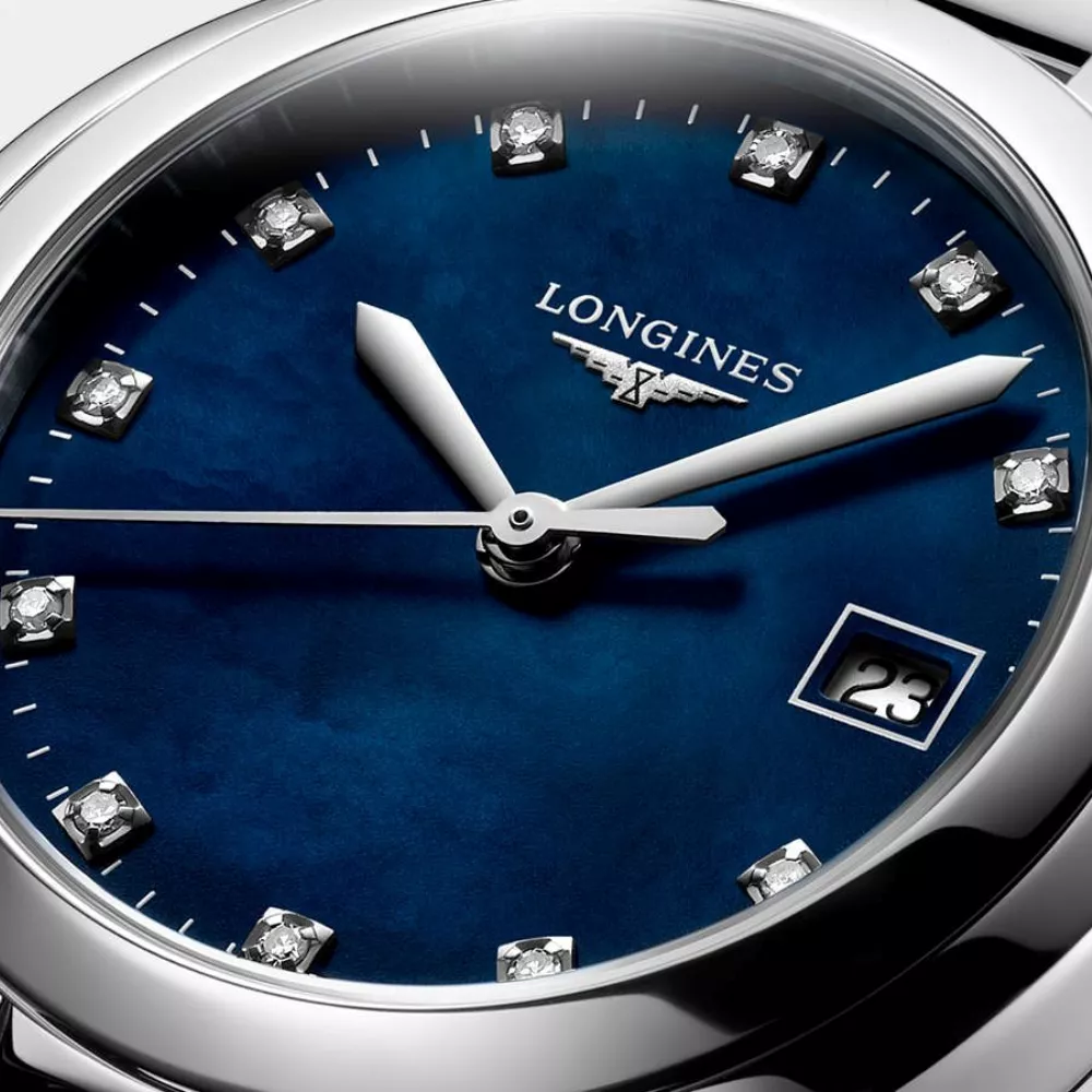 Sat iz kolekcije Longines PrimaLuna odiše elegancijom i luksuzom, savršen za dame koje traže prefinjen i sofisticiran dodatak svom stilu. Kućište i narukvica izrađeni su od visokokvalitetnog nerđajućeg čelika, dok fiksni bezel dodatno naglašava klasičan dizajn. Brojčanik od plavog majčinskog bisera ukrašen je srebrnim kazaljkama i dijamantima kao markerima sati, uz oznake minuta koje se nalaze oko spoljne ivice, pružajući izuzetnu preglednost. Analogni prikaz upotpunjen je funkcijom prikaza datuma na poziciji tri sata, a sat pokreće kvarcni mehanizam. Zaštitu brojčanika obezbeđuje safirno staklo otporno na grebanje, dok je zadnji deo kućišta izrađen od čvrstog nerđajućeg čelika. Okruglo kućište prečnika 30 mm i debljine 7,9 mm savršeno pristaje na zglob, dok preklapajuća kopča sa tasterima za brzo otpuštanje pruža dodatnu sigurnost i udobnost. Vodootpornost od 30 metara omogućava svakodnevnu upotrebu, dok funkcije uključuju prikaz sati, minuta, sekundi, datuma i indikator pražnjenja baterije (EOL). Sat dolazi u originalnoj Longines kutiji sa kompletnom dodatnom opremom, uključujući priručnik. Ovaj model iz kolekcije PrimaLuna, prepoznatljiv po luksuznom dizajnu i švajcarskoj preciznosti, predstavlja idealan izbor za sve dame koje žele da istaknu svoj stil.
