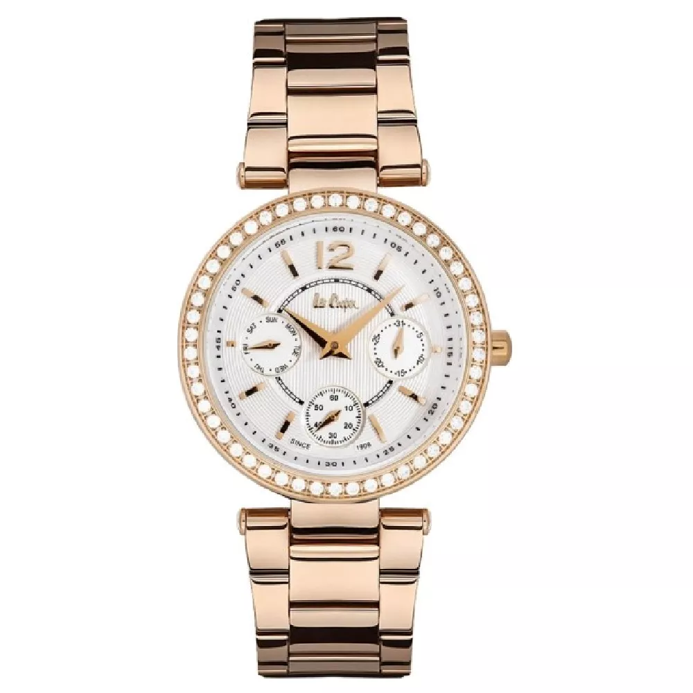 Sofisticiran dizajn ženskog ručnog sata brenda Lee Cooper, odlikuje se brojčanikom u beloj boji, podbrojčanicima i nizom cirkona smeštenim na lineti sata. Svojom jednostavnošću lako se kombinuje uz svakodnevni odevni stil.