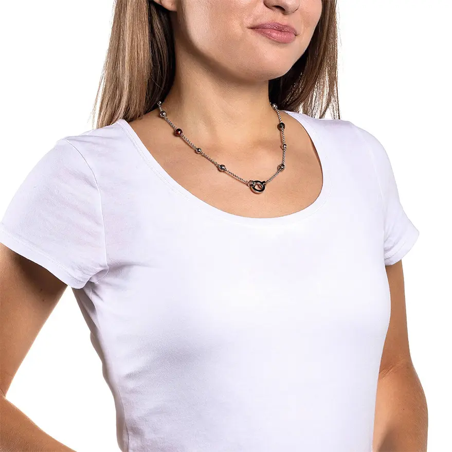 Ogrlica brenda Leonardo srebrne i crvene bojoe .Ukrašena je priveskom u obliku kruga srebrne boje.Upotpuniće Vašu svakodnevnu odevnu kombinaciju.