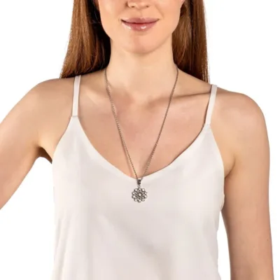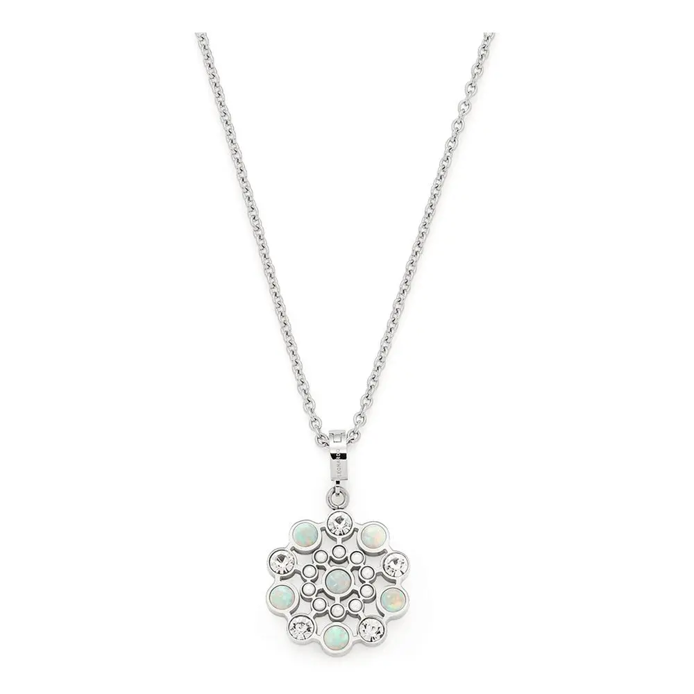 Ogrlica brenda Leonardo iz kolekcije Nina.Srebrne je boje i upotpunjena je priveskom u obliku cveta.Privezak je ukrašen detaljima kao što su imitacija bisera i stakleni kristali.Upotpuniće Vašu svakodnevnu odevnu kombinaciju.