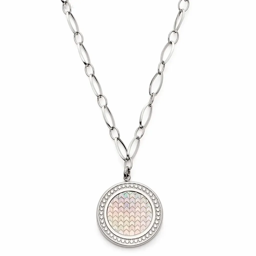 Leonardo ženska ogrlica. Izrađena od visokokvalitetnog nerđajućeg čelika u srebrnoj boji. U kombinaciji sa neobičnim priveskom koji stvara iluziju boja čini savršenu kombinaciju stila koji odgovara svakoj odevnoj kombinaciji.