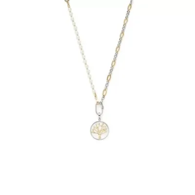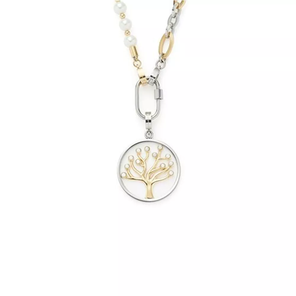 Ženska ogrlica brenda Leonardo izrađena od nerđajućeg čelika visokog kvaliteta sa kombinacijom detalja u srebrnom i zlatnom tonu. Na njoj se nalazi privezak u obliku drveta sa belim perlama.