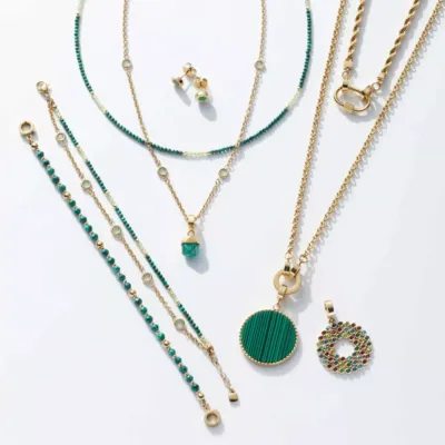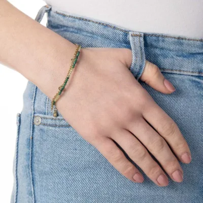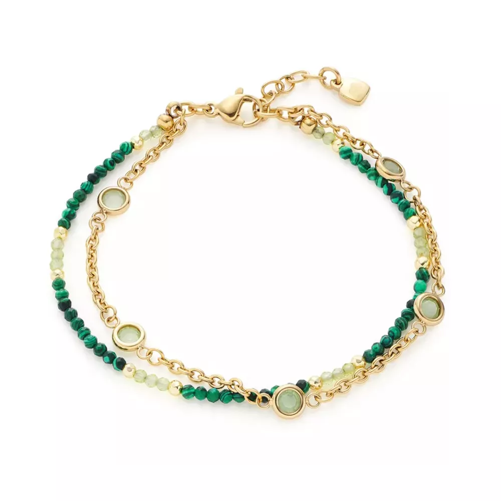 Leonardo narukvica sa dva lanca dizajnirana je identično kao i odgovarajuc´a ogrlica, a takođe se sastoji od sitnih, fasetiranih, perli od poludragog kamena malahita i svetlo zelenog, fasetiranog staklenog kamenja i zlatnih perli od nerđajuc´eg čelika.