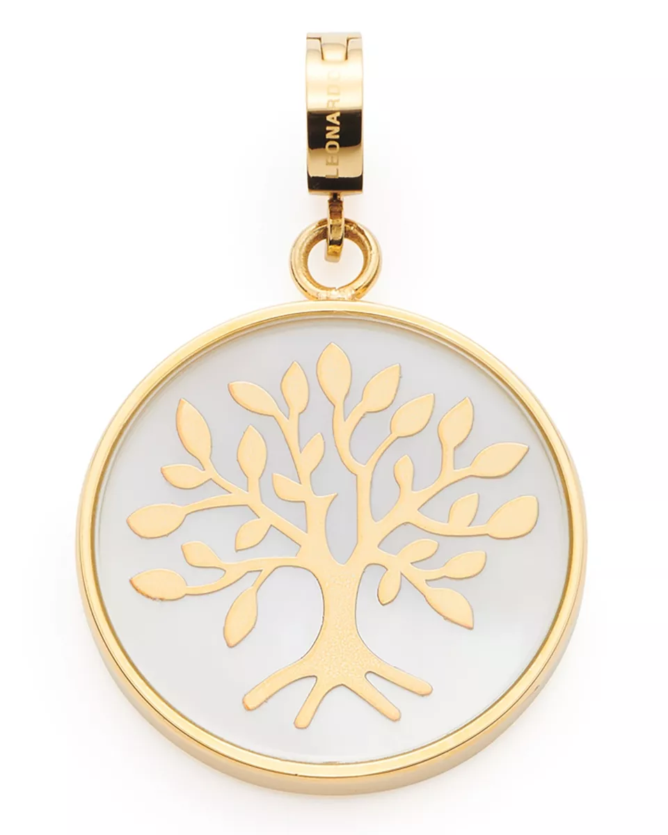 Privezak brenda Leonardo, od poliranog narđajućeg čelika. Drvo života je obloženo mat brušenim nerđajućim čelikom boje zlata.Kopča je uglačana i sa ugraviranim imenom brenda.