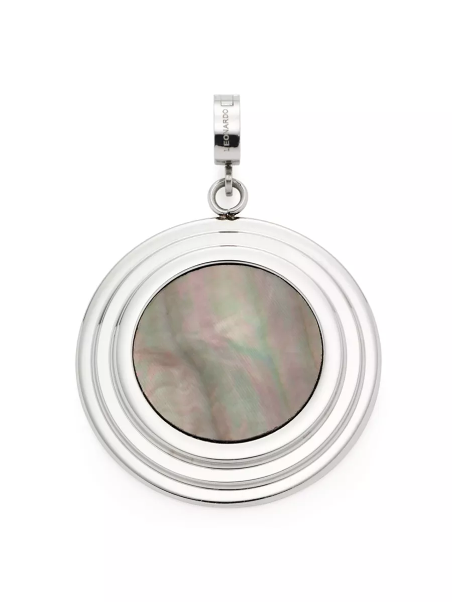 Privezak iz Leonardo kolekcije oduševljava svojom promenljivošc´u. Okrugli privezak je napravljen od nerđajuc´eg čelika u boji srebra, dok se u sredini nalazi svetlucavi sedefni umetak sive boje. Mini klip olakšava kombinovanje sa različitim lancima.