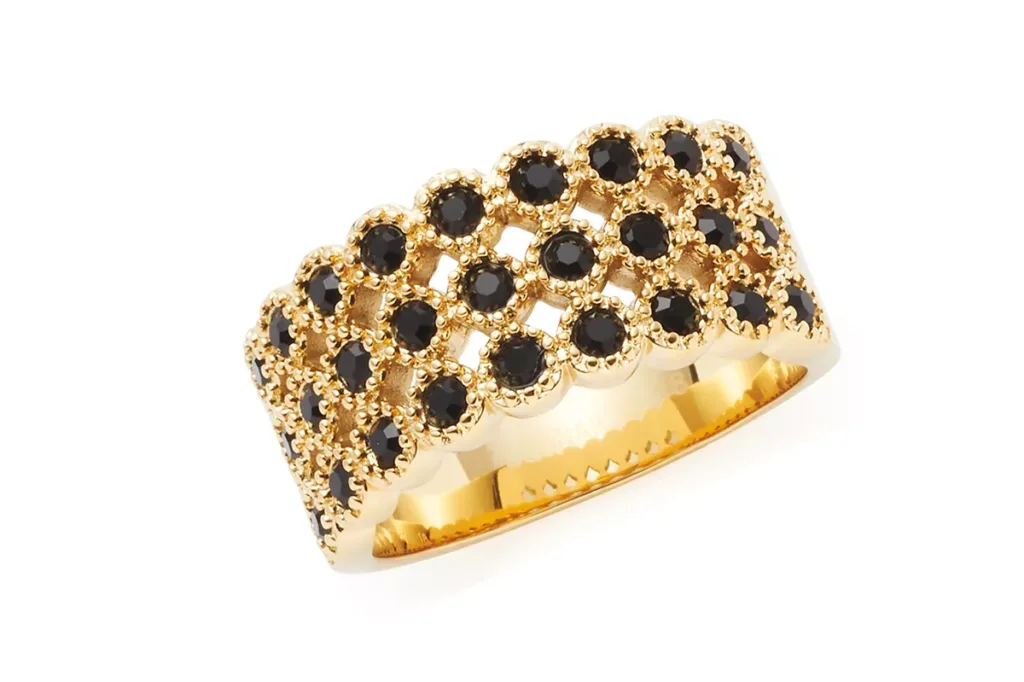 Leonardo ženski prsten, izrađen od visokokvalitetnog nerđajućeg čelika u zlatnoj boji sa sitnim crnim kristalima.