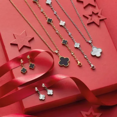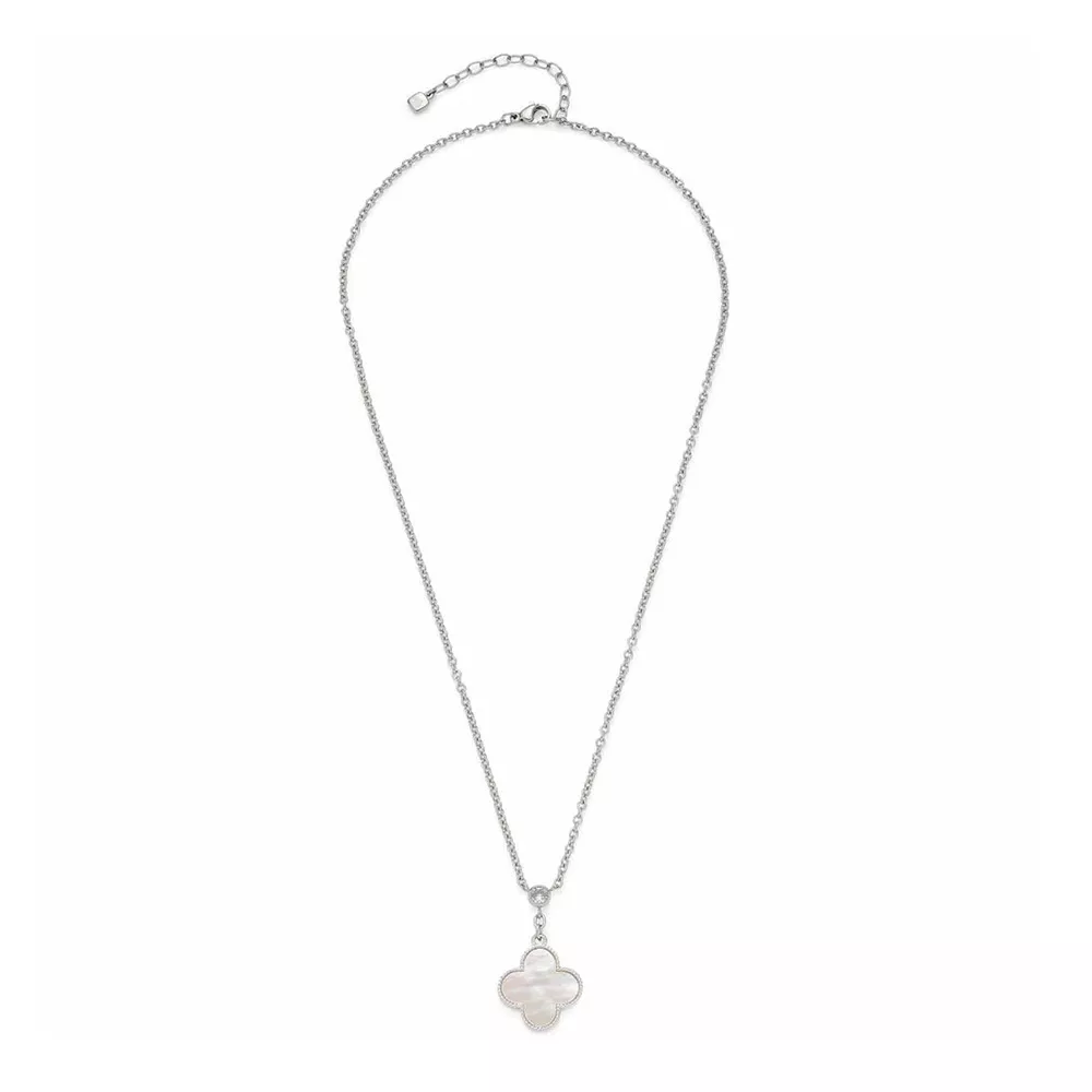 Kažu da ko otkrije detelinu sa četiri lista, blagosloven je srec´om, jer samo jedna od hiljadu detelina ima četiri lista. List srec´ne deteline je pričvršc´en u stilizovanom obliku Leonardo ogrlice. Beli sedef prekriva celu površinu ovog privezka i okružen je fino urađenom ivicom.