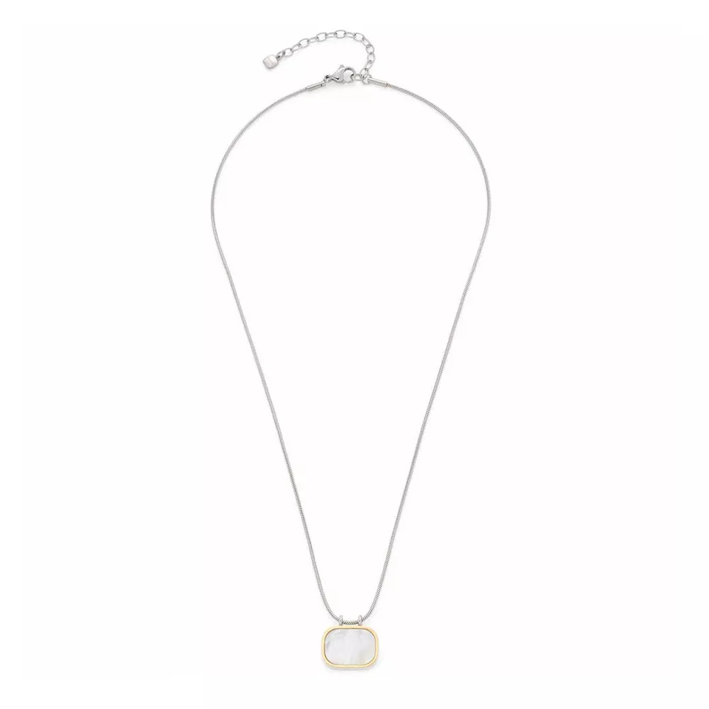 Snažno zaobljeni pravougaoni oblik Leonardo ogrlice ispunjen je belim sedefom i uokviren nerđajuc´im čelikom u modernom dvobojnom izgledu. Jednostavno odličan komad nakita lak za uklopiti.