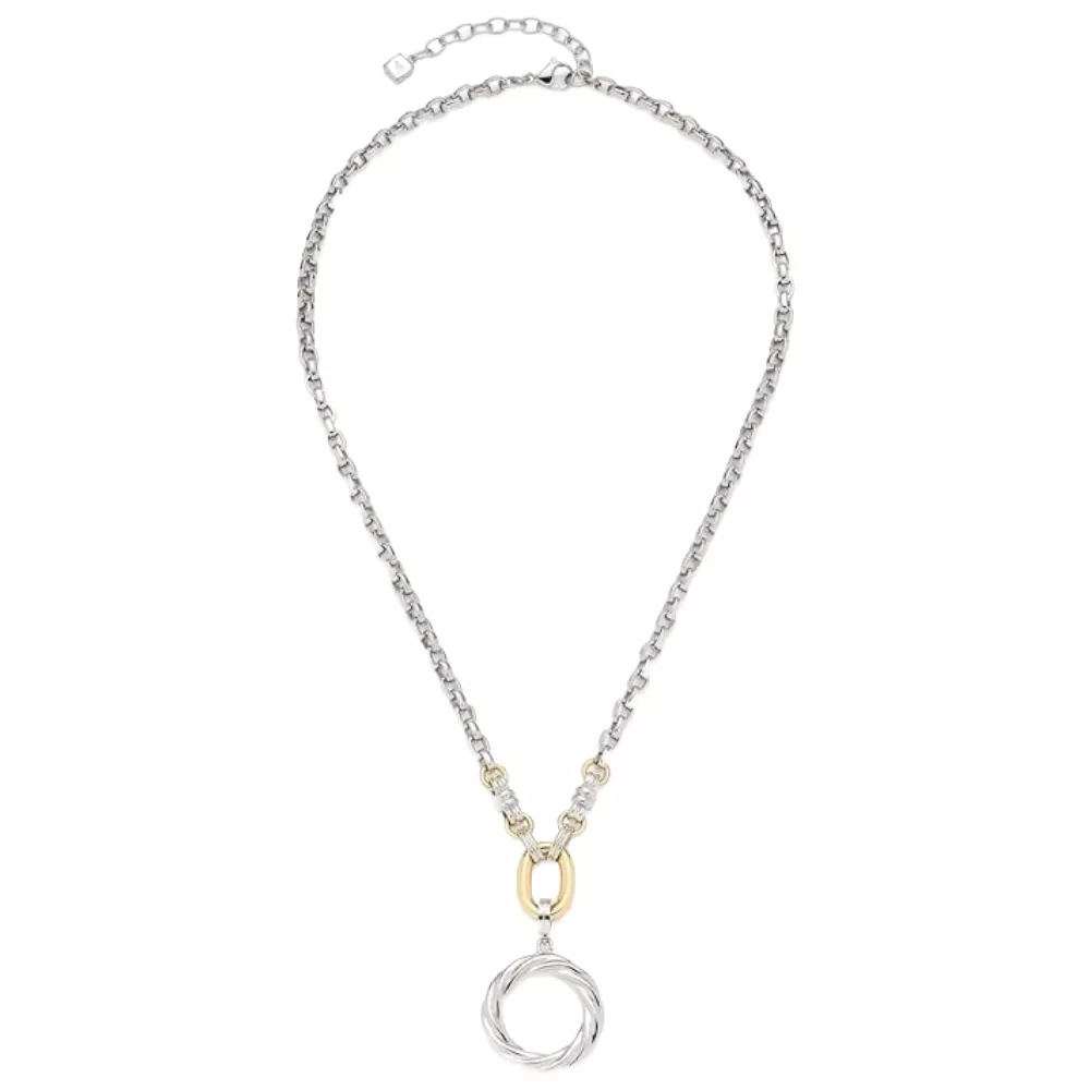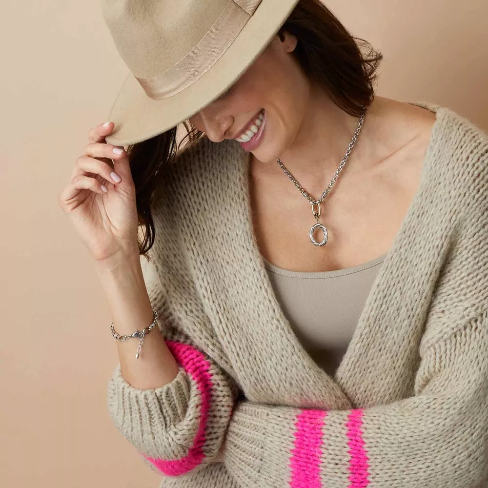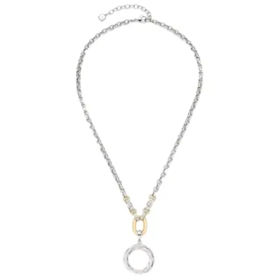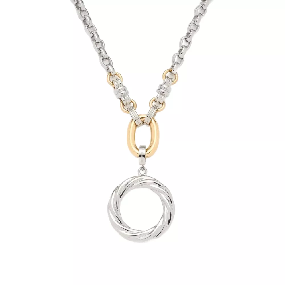 Gruba struktura veza elemenata daje Leonardo ogrlici trendi dizajn. Privlačan izgled upotpunjuju bikolor elementi u obliku ukrasnih alkica i ovalnog prstena. Kružni privezak podseća na uvrnuti kabel pružiće vanvremenski raskošan izgled.