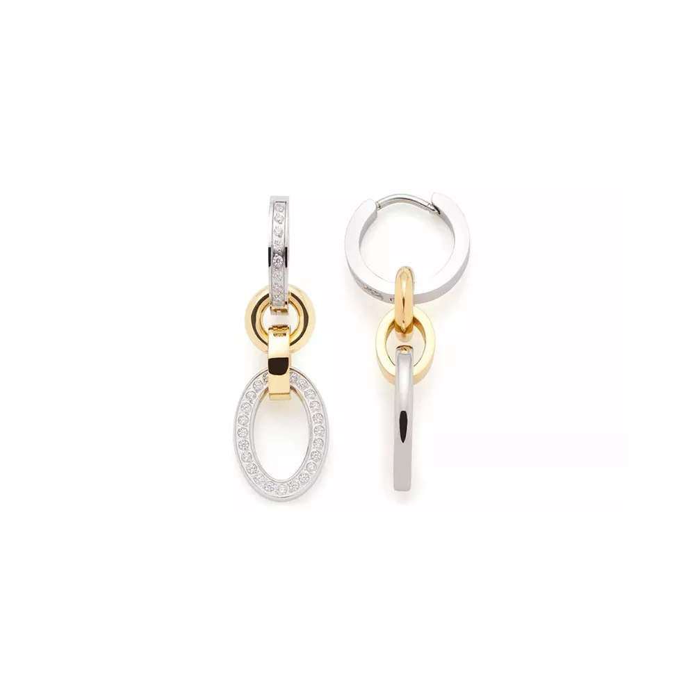 Impresivne Leonardo minđuše od dve dvobojne alke mogu se nositi na više načina. Može se promeniti redosled alki, a mogu i bez kopče. Dimenzije minđuša: 3.2×1.3cm.