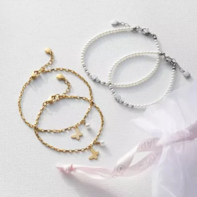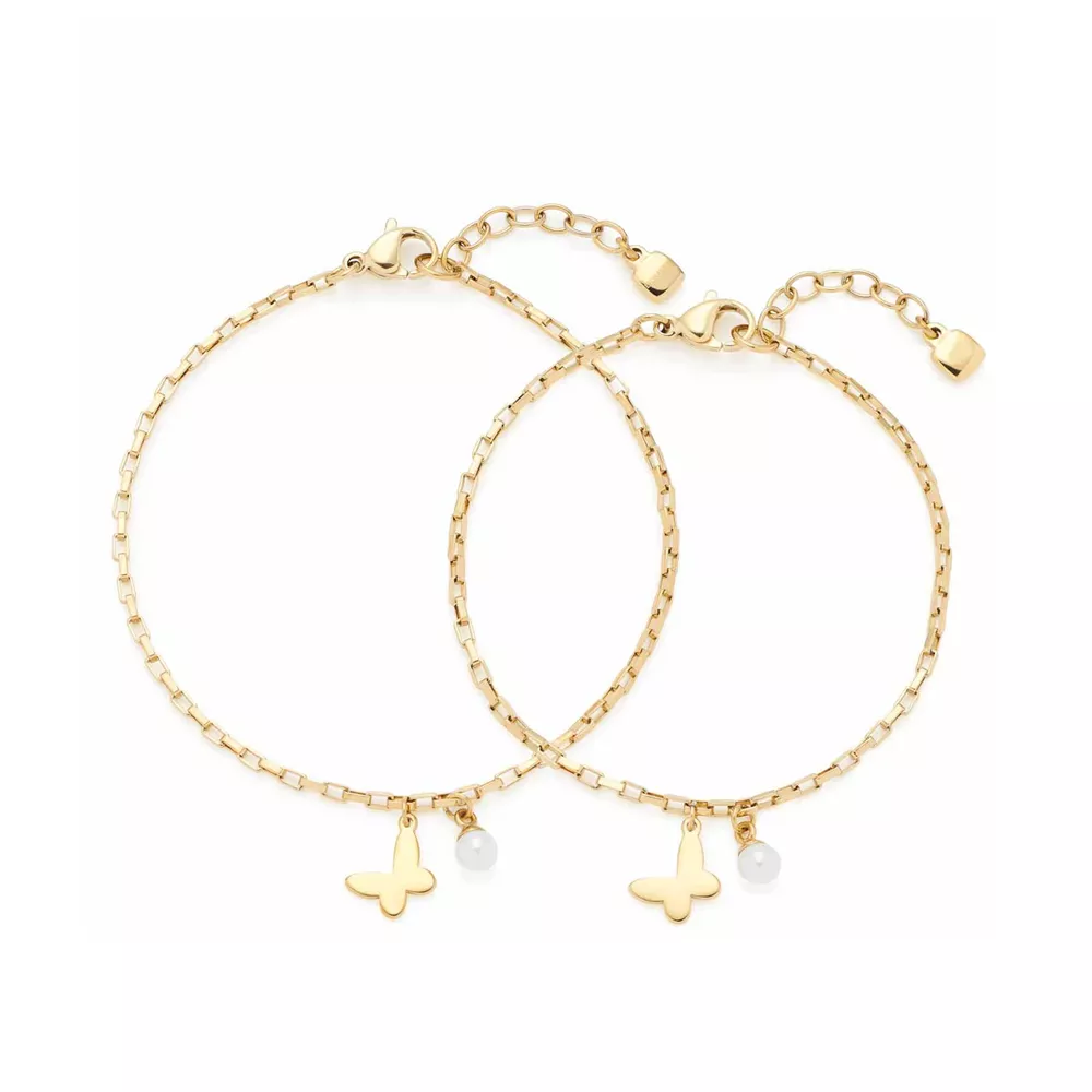 Ovaj set narukvica je savršen za proslavu posebne veze između majke i c´erke. Obe narukvice se sastoje od širokog kvadratnog lanca. Svaka sadrži po dva mala priveska, mali, apstraktni leptir i bisernu perlu. Komadi nakita se zatvaraju klasičnom jastog kopčom. Mala narukvica ima dužinu od 15,5-18 cm, a vec´a narukvica ima dužinu od 17,5-20 cm.