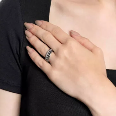 Lep detalj na svakoj ruci – prsten deluje posebno elegantno sa svojim efektom blistanja. Ima blago zaobljen izgled, srednje širine. Ističu ga tri pavé linije od belih i crnih cirkon-steinova koje se prostiru oko prstena. One ga čine pravim remek-djelom koje obogaćuje svaku kutiju za nakit. Zahvaljujući blagoj unutrašnjoj zaobljenosti, prsten se takođe veoma udobno nosi.