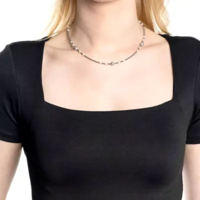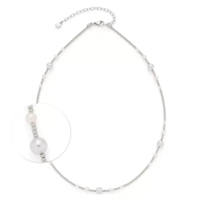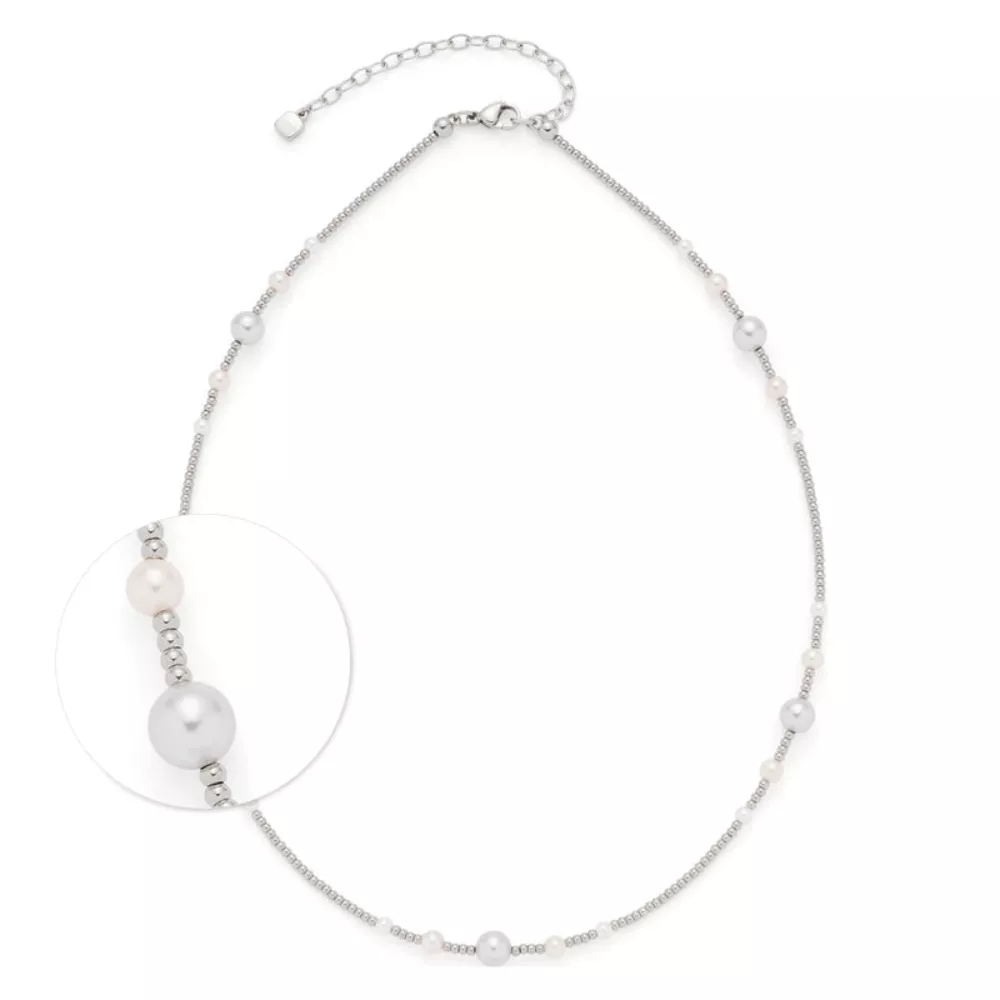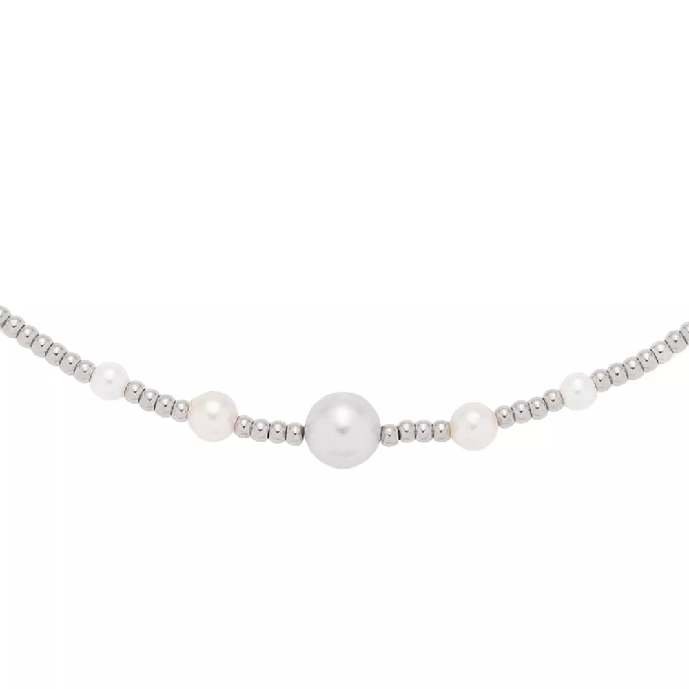Fini biseri u tri različite nijanse boja daju ovoj kratkoj ogrlici njen minimalističko-elegantni izgled. U simetričnim razmacima, biseri različitih veličina u beloj, krem i svetlosivoj boji nanizani su sa čeličnim kuglicama u delikatni kolijer. Biseri stvaraju prelep kontrast sa poliranim nerđajućim čelikom. Ogrlica ima kopču na karabin i lančić za produžavanje, koji omogućavaju optimalno prijanjanje. Sve u svemu, ogrlica je idealna za moderne slojevite kombinacije nakita.