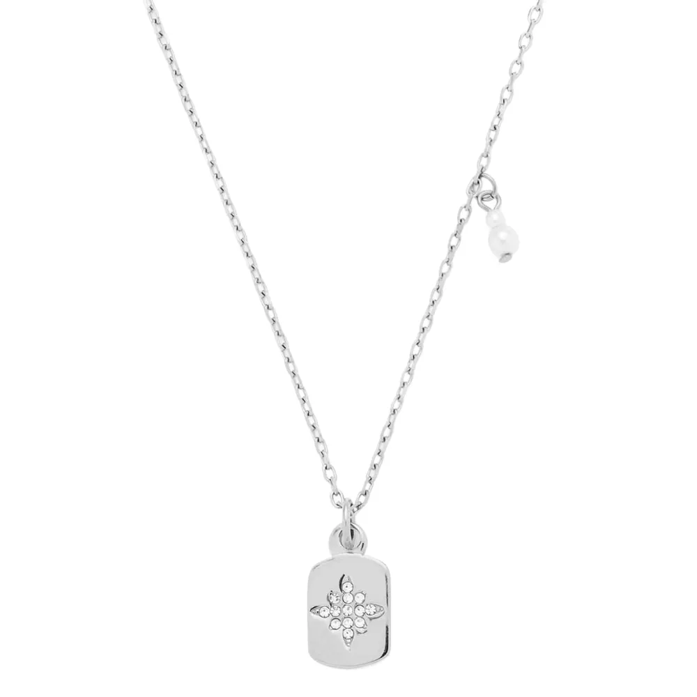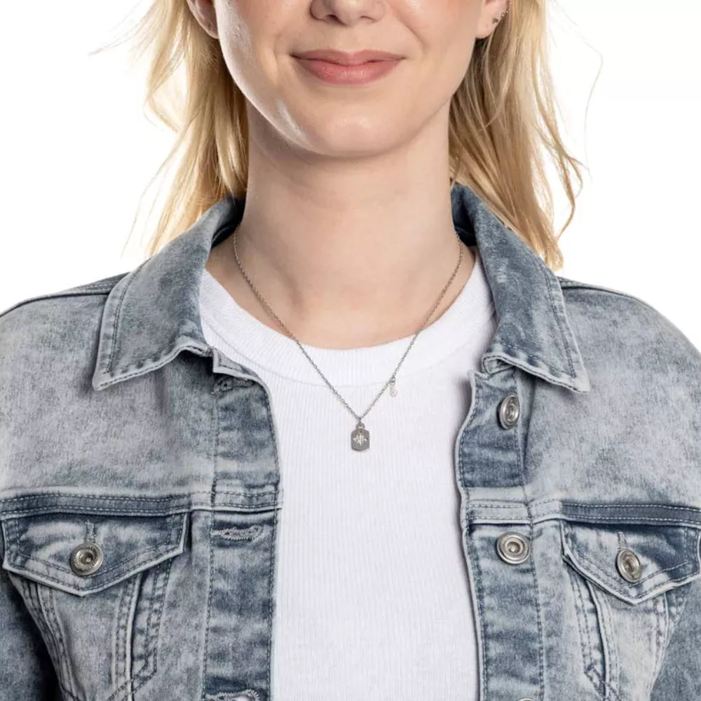 Kratka anker ogrlica od nerđajućeg čelika savršeno se uklapa u popularne slojevite stilove, ali jednako efektno izgleda i kada se nosi samostalno. U središtu pažnje je meko oblikovan, pravougaoni privezak. Sitni cirkoni u obliku zvezde dodaju mu prefinjeni sjaj. Dodatno, na ogrlici su okačene dve biserne perle postavljene jedna iznad druge, koje stvaraju šarmantan kontrast. Zahvaljujući produžetku, dužina ogrlice može se lako prilagoditi.