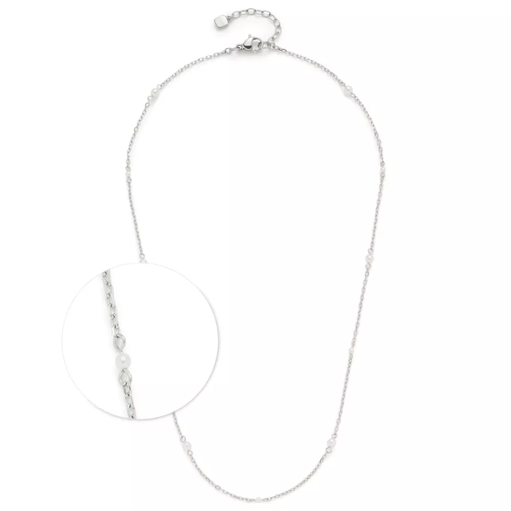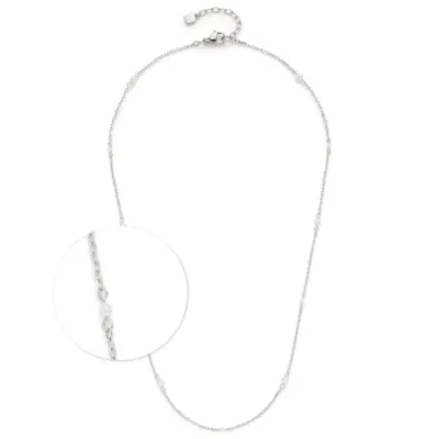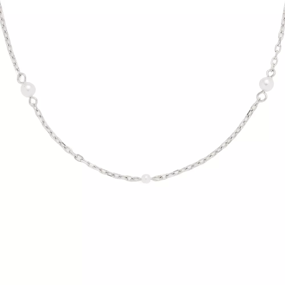 Klasičan nakit za vrat u modernoj interpretaciji: Na kratkom anker lancu sa karabinjer kopčom i produžetkom, u pravilnim razmacima, smenjuju se bele perle u dve veličine. Ovaj nežni lančić odiše filigranskom elegancijom i može se nositi samostalno ili u kombinaciji s drugim ogrlicama u trendi slojevitom stilu. Njegov suptilan dizajn svakom dekolteu daje profinjenu, ženstvenu notu.
