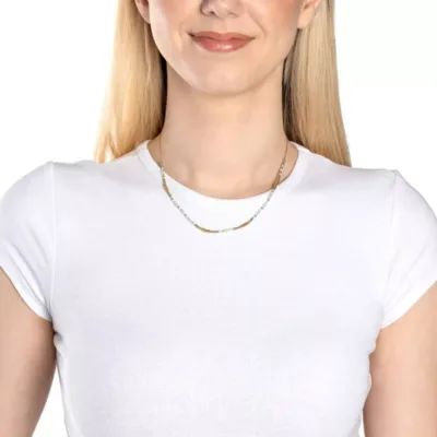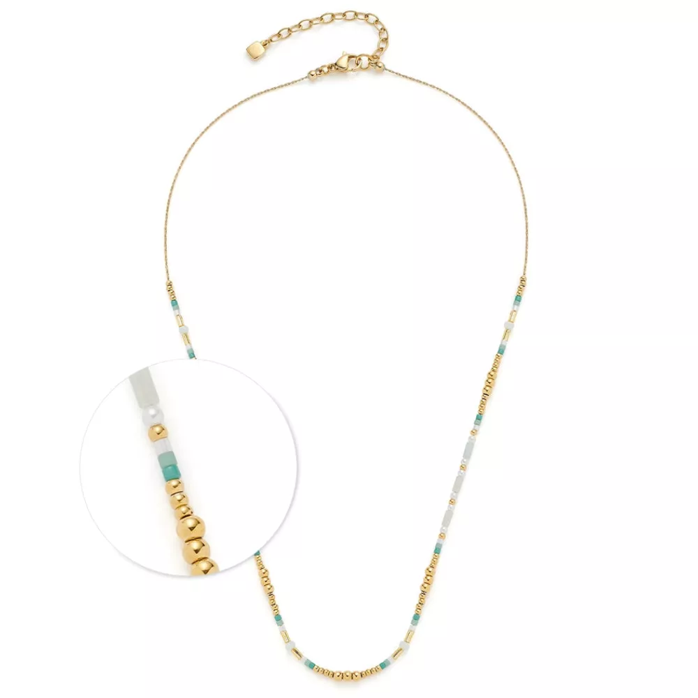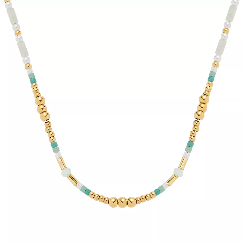 Inspirisana suncem i morem, ova ogrlica spaja fine zlatne kuglice i valjčiće sa perlama u nijansama tirkizne i bele. Paleta boja odiše harmonijom i senzualnošću. Imitacije bisera sa prirodnim izgledom dodatno naglašavaju letnji karakter ove nežno obojene ogrlice. Za maksimalan komfor pri nošenju, deo koji dolazi uz vrat i sa strane ostaje bez perli.