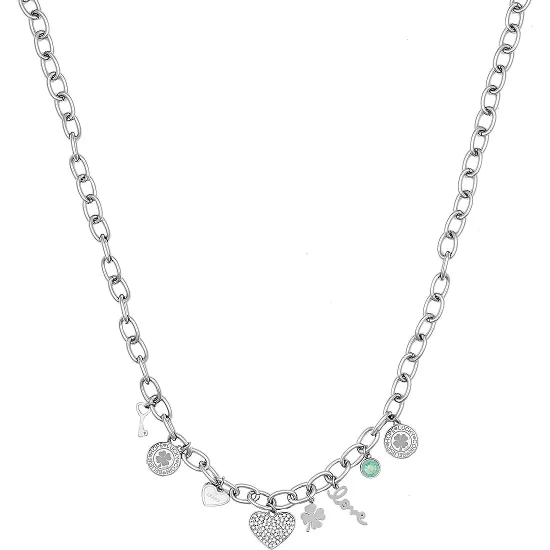 Ženska ogrlica italijanskog brenda Liu Jo izrađena od nerđajućeg čelika u boji srebra sa priveskom na kojem je istaknut privezak u obliku srca, deteline,ključića i jedan na kojem je istaknut logotip brenda. Dužina ogrlice je 50cm i napravljena je od hirurskog čelika. Pogodna je za svakodnevno nošenje.