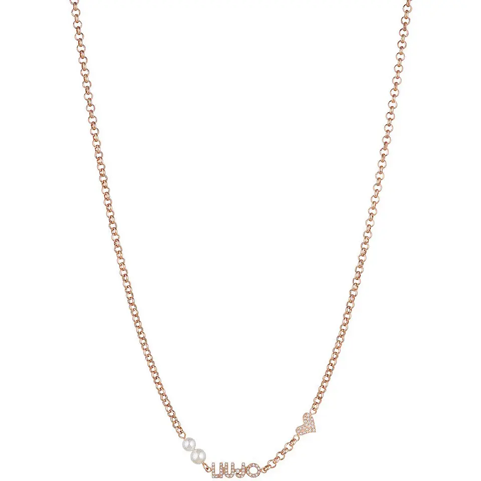Romantična ženska ogrlica brenda Liu Jo. Napravljena od visokokvalitetnog hiruškog čelika u boji roze zlata. Ukrašena nežnim srcem i sintetičkim perlama. U centru ogrlice dominira naziv brenda.Prozirni kristali daju ovoj ogrlici blistav sjaj. Ukrasite svoj dekolte ovom finom ogrlicom.