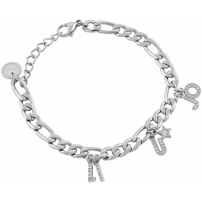 Ženska narukvica italijanskog brenda Liu Jo izrađena od nerđajućeg čelika u boji srebra sa privescima na kojem su istaknuta slova naziva brenda i privezak u obliku zvezdice. Dužina narukvice je 17,5cm i napravljena je od hirurskog čelika. Pogodna je za svakodnevno nošenje.